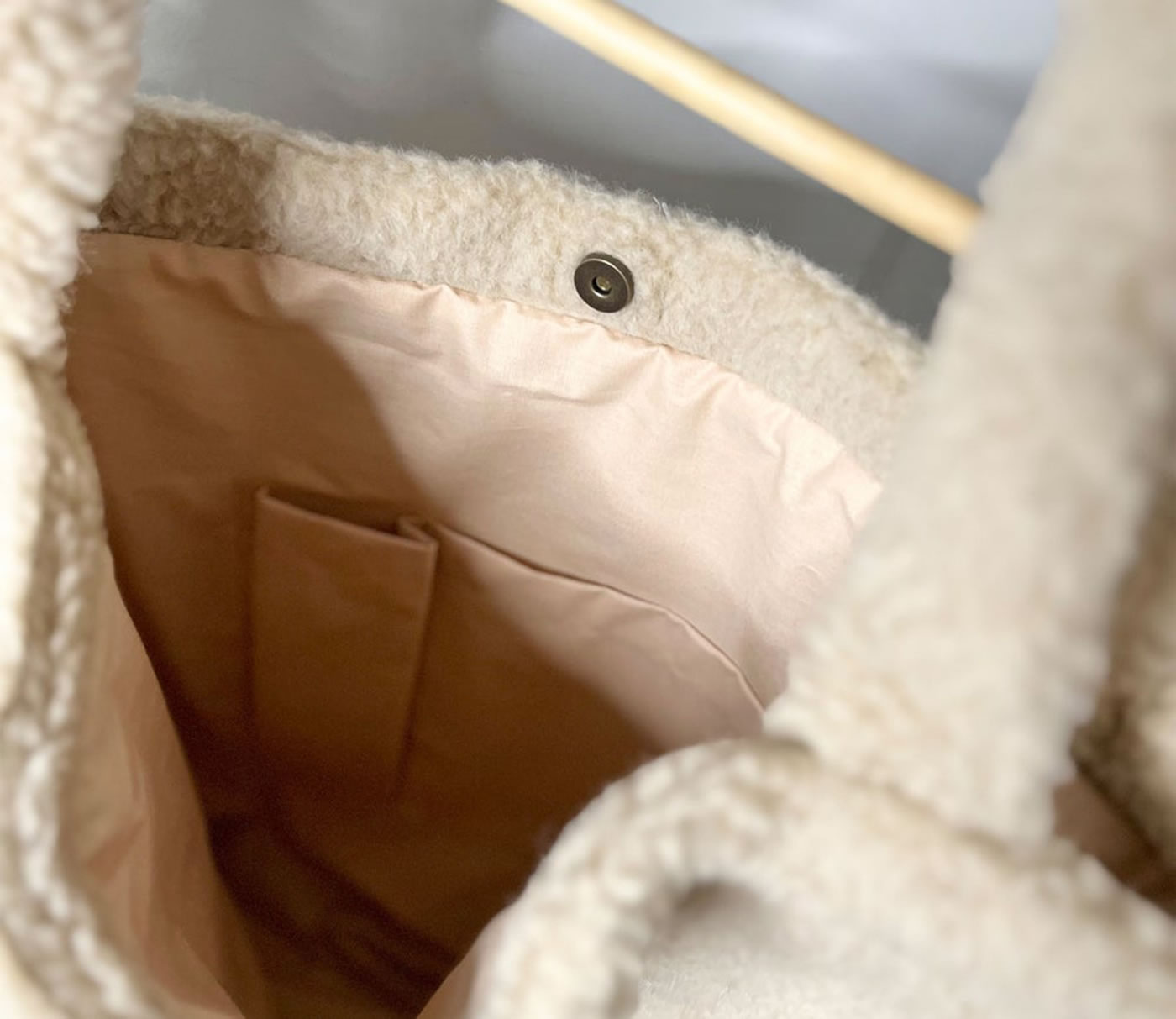 Mit einem Magnetdruckknopf lässt sich MOM BAG öffnen und schließen. Das Material zeichnet sich durch außergewöhnliche Weichheit und Elastizität aus. Charakteristisch für dieses Material ist seine schwarze Basis, die die Farbe des verwendeten Wollvlieses intensiv zur Geltung bringt.