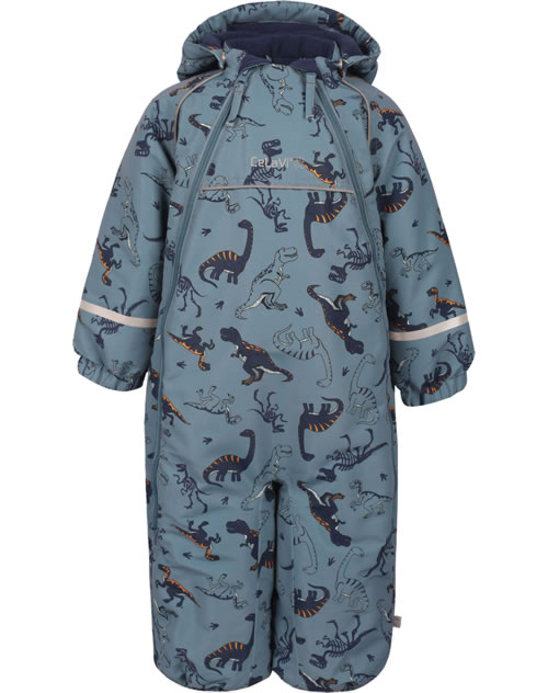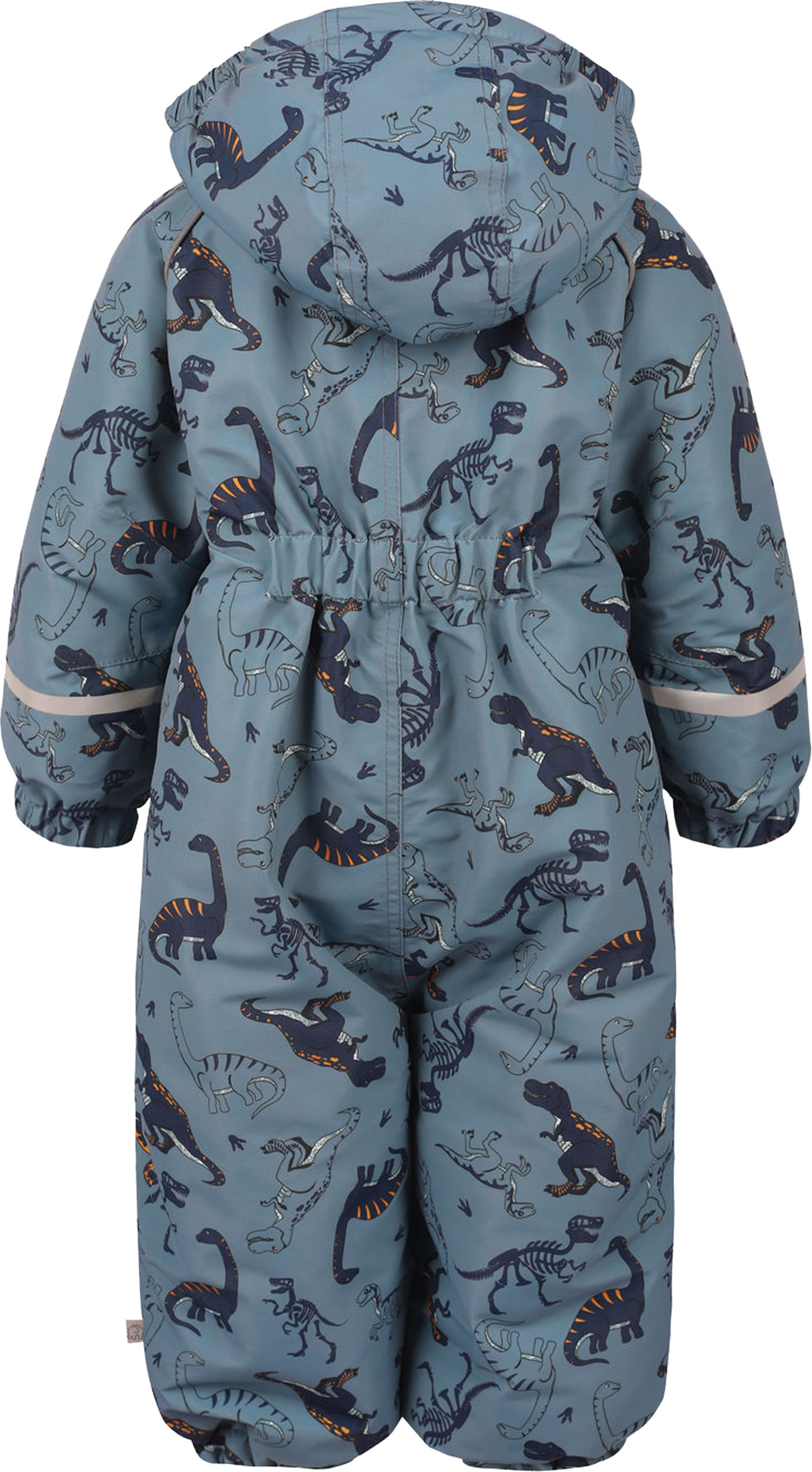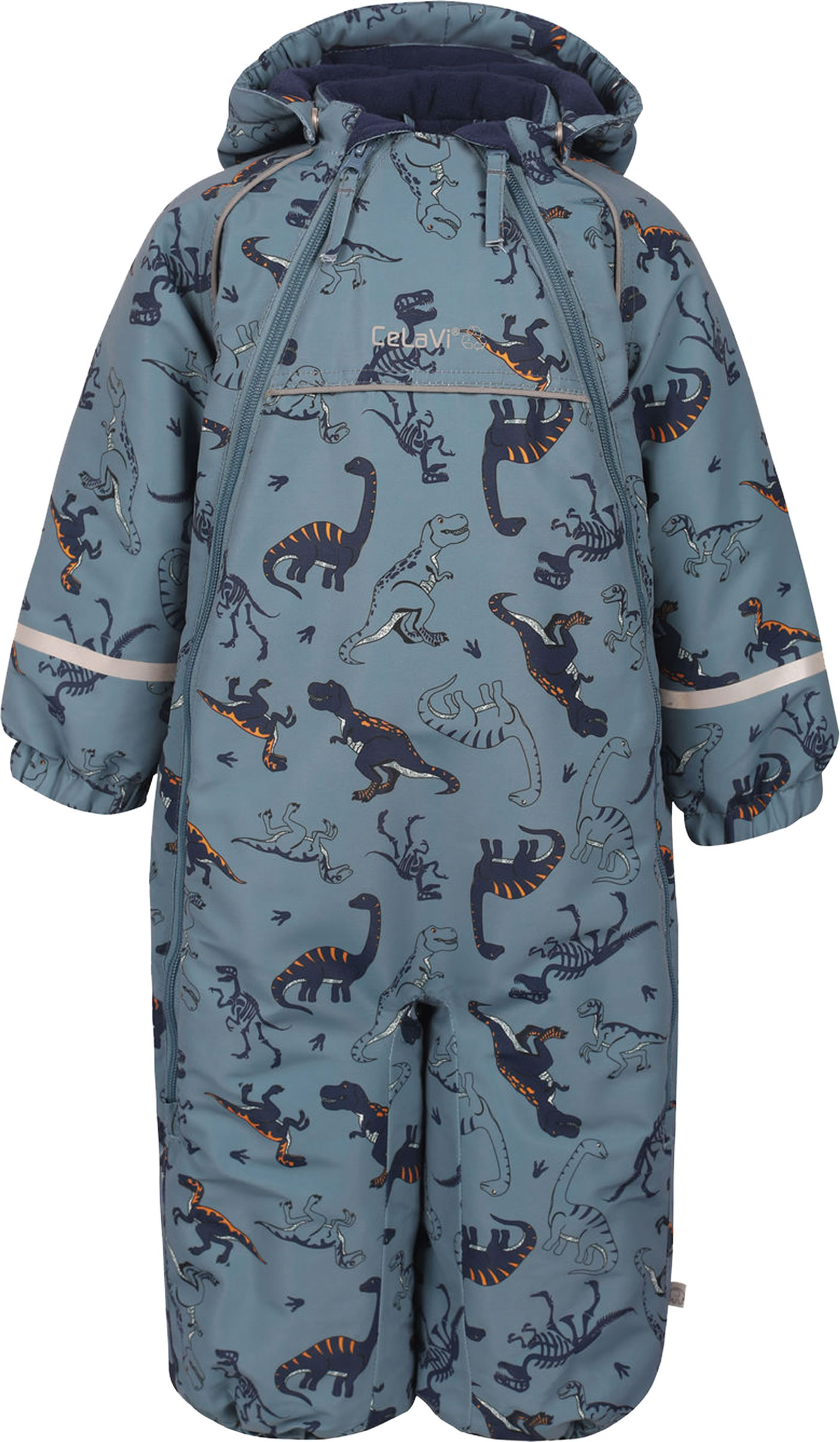 Mit diesem tollen Anzug von CELAVI mit abknöpfbarer Kapuze ist Ihr Kind gegen Wasser und Wind geschützt. In einem schönen Blau-Ton und mit hübschem Dino Allover-Print ist der Schneeoverall ein absoluter Hingucker! Die Ärmel sind mit einem Gummi-Bund versehen. Das Hochrutschen der Hosenbeine wird durch einen elastischen Gummi-Bund und einen längenverstellbaren Steg verhindert, der unter die Gummistiefel gesteckt werden kann. Reflektierende Streifen geben Sicherheit an trüben Tagen und in der Dunkelheit. Der Overall ist mit weichem Fleece ausgestattet. Die zwei Reißverschlüsse erleichtern das An-und Ausziehen.