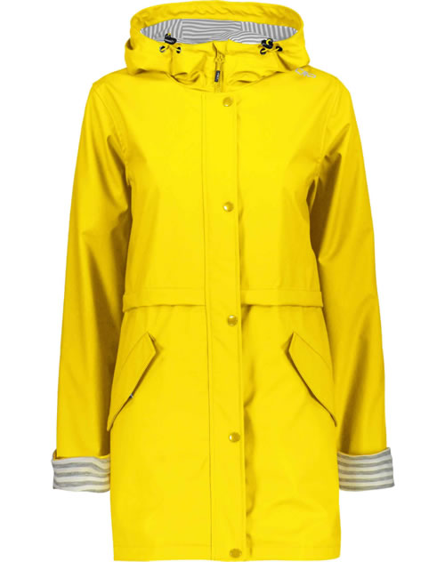Zeitloser Regenmantel für Damen in gelb von CMP. Mit fester Kapuze ist der wasser- und winddichte Begleiter bei jedem Wetter ein toller Blickfang. Praktische Taschen mit Laschen und Druckknöpfen, eine zusätzliche Knopfleiste über dem Reißverschluss und das grau/weiß geringelte Baumwollfutter, mit dem die Kapuze und die Ärmelenden von innen weich gefüttert sind, machen sie zu einem Lieblingsstück.