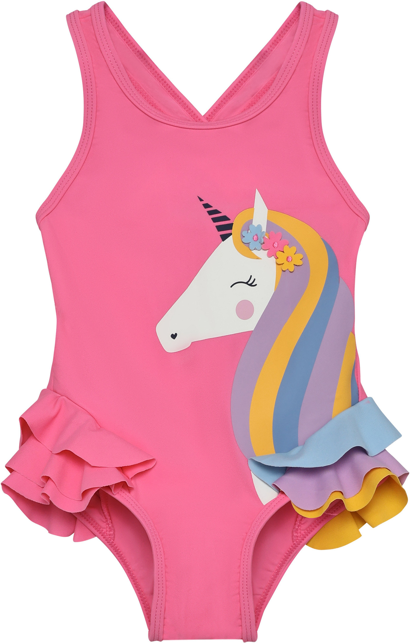 Die Mähne des Einhorns geht raffiniert einseitig in den Rüschenbesatz an den Hüften über. 🌈