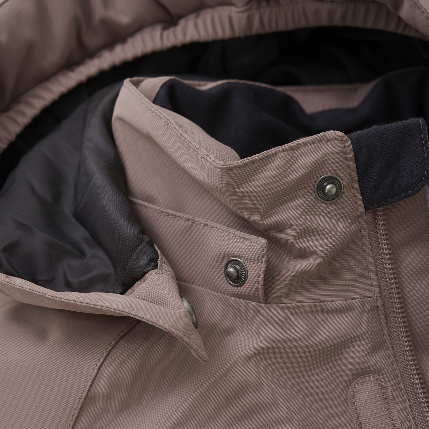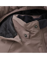 Der Schneeanzug hat eine abnehmbare Kapuze.