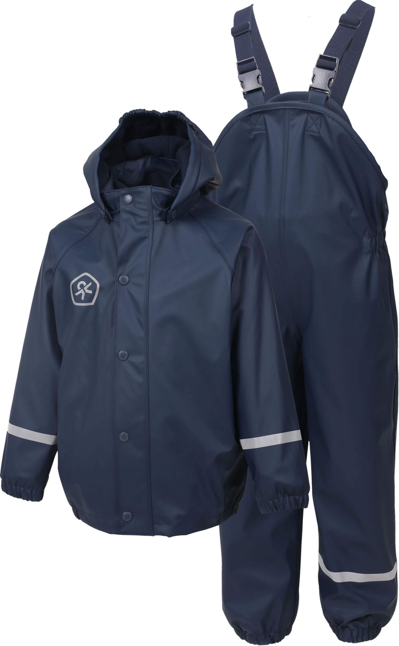 Der Anzug mit abknöpfbarer Kapuze schützt gegen Wasser und Wind. Die Ärmel sind mit einem Gummi-Bund versehen. Das Hochrutschen der Hosenbeine wird durch einen elastischen Gummi-Bund und einen längenverstellbaren Steg verhindert. Reflektive Details geben mehr Sicherherit. Das Set ist von innen komplett ist mit weichem Fleece ausgestattet.