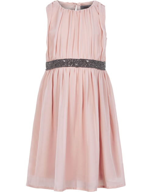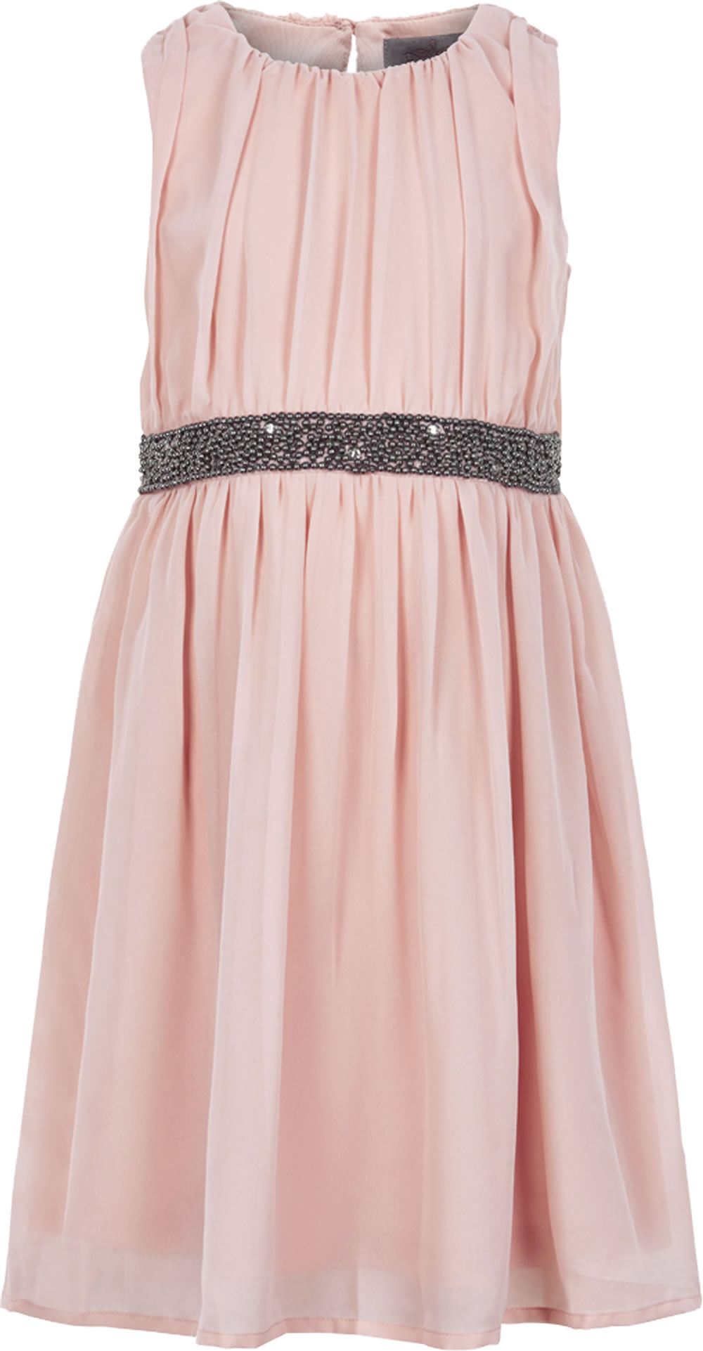 Hübsches ärmelloses Kleid in zartem rosa von CREAMIE. Der Rock ist vom Oberteil durch einen halbrunden Bund aus Perlen und Abnähern optisch getrennt. Schließen lässt sich das Kleid durch einen Knopf am Rücken. Ein Unterrock sorgt für einen hohen Tragekomfort und gibt dem Kleid extra Pepp.