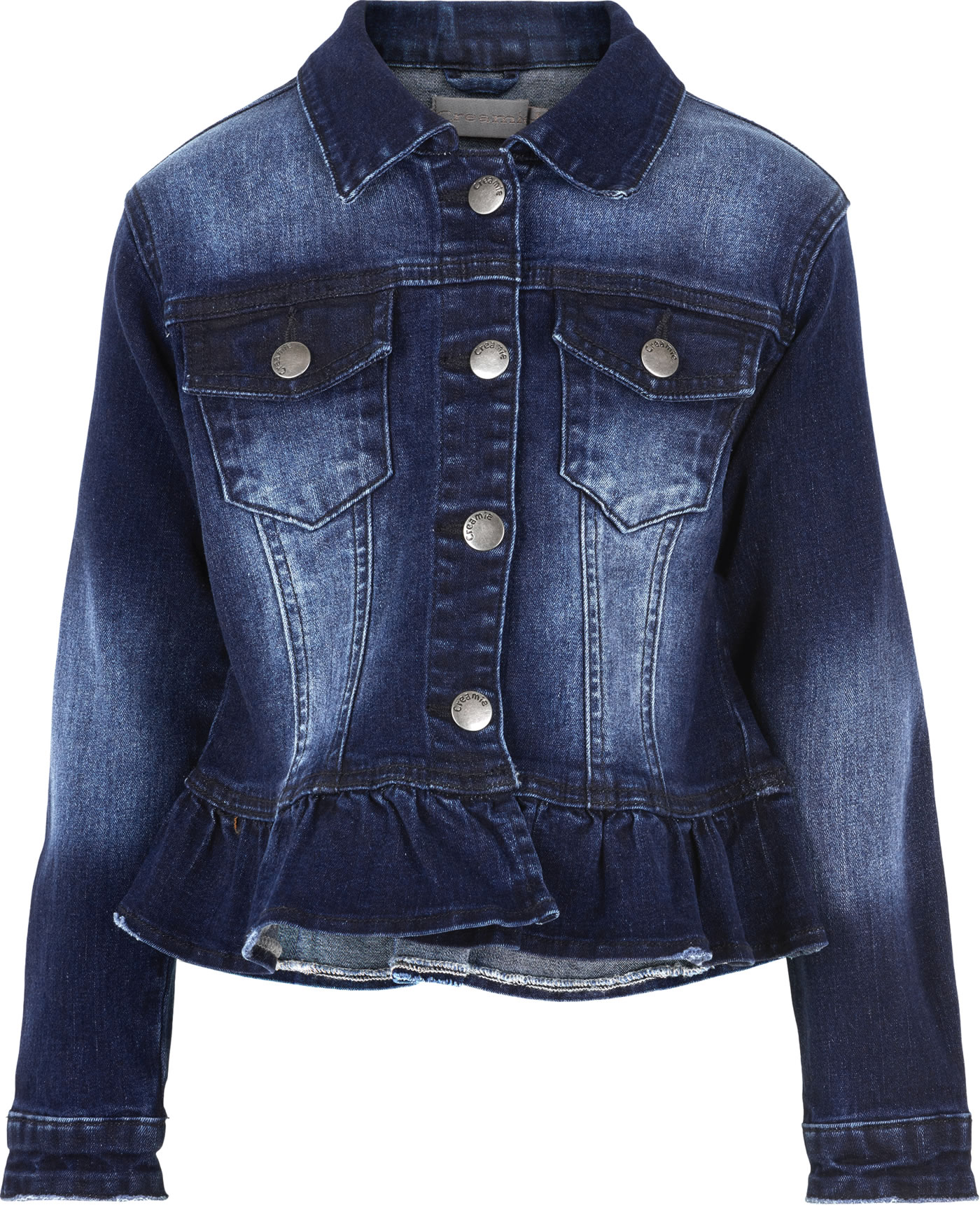 Verspielte Jeans-Jacke mit Schößchen von CREAMIE in dark denim für Mädchen. Eine optisches Hightlight sind die vielen Destroyed-Elemente. Durch ihren Used-Look ist diese Jeans-Jacke ein absolutes Must-have für diese Saison.