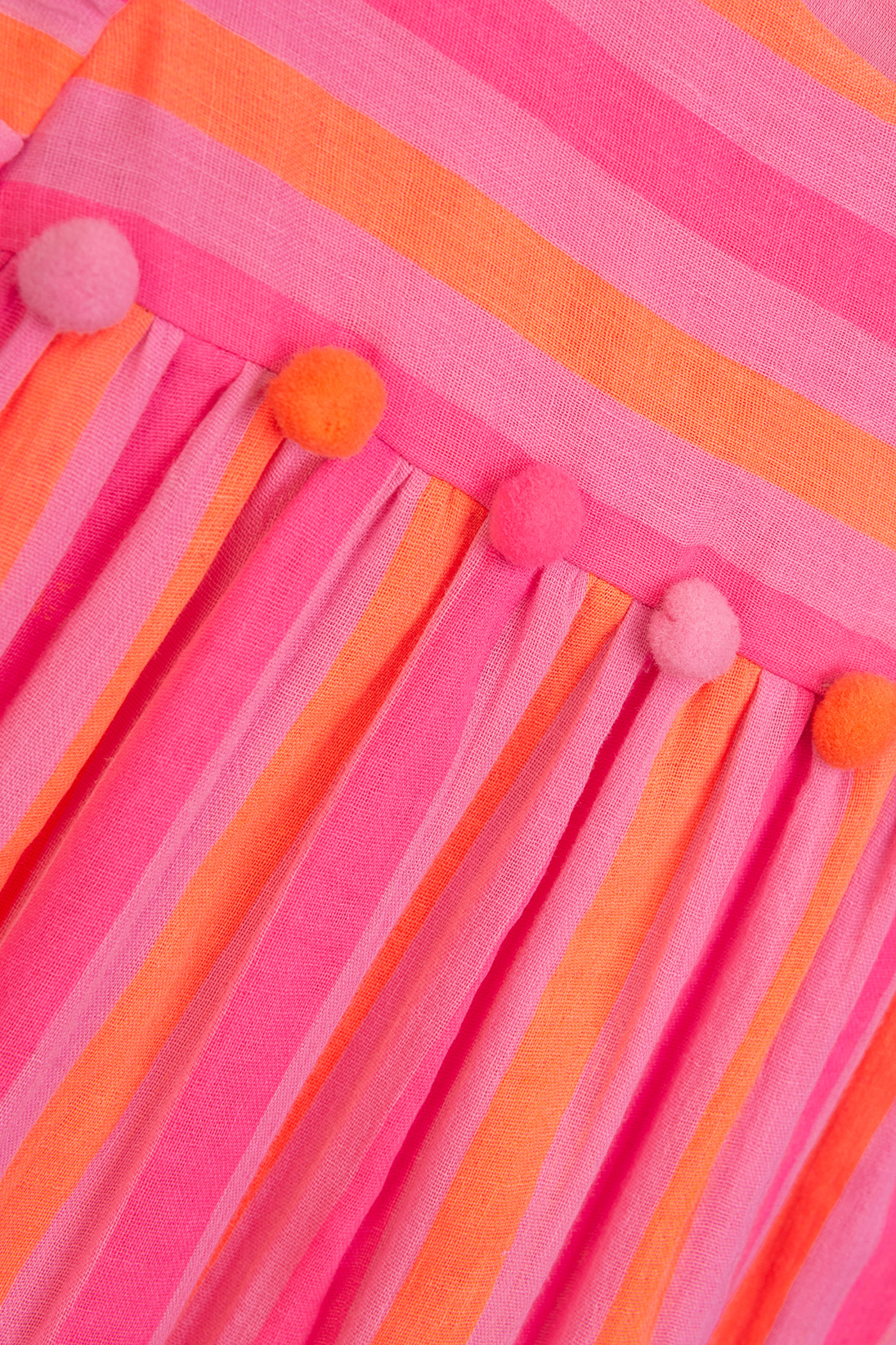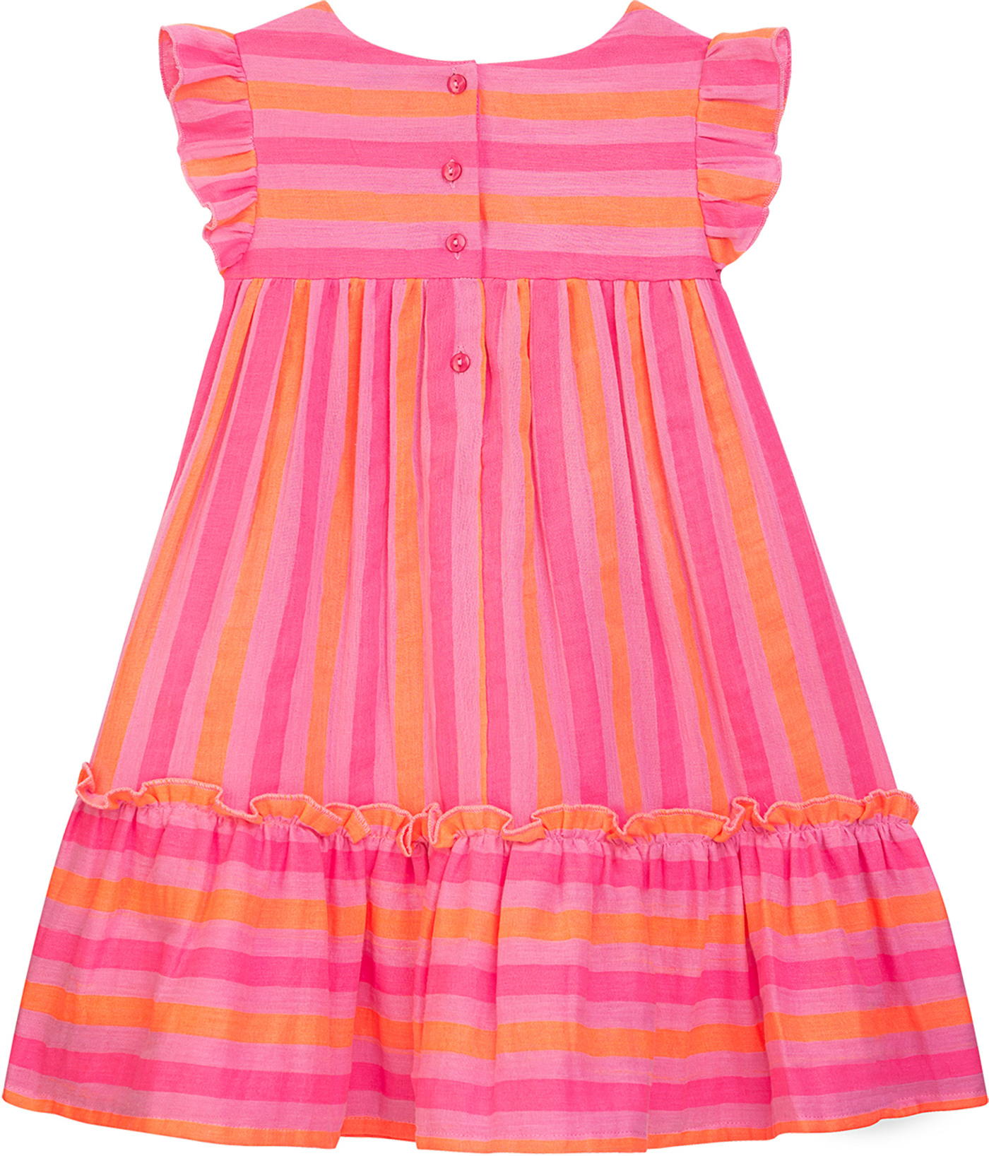 Dieses süße, gestreifte Kleid in leuchtendem Neon Pink ist aus reiner, luftiger Baumwolle gefertigt und verzaubert mit vielen süßen Details 🌿💗