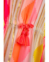 Gold schimmernde Längsstreifen sowie orangefarbende Bommel entlang des Saumes runden den sommerlichen Look ab. 😎