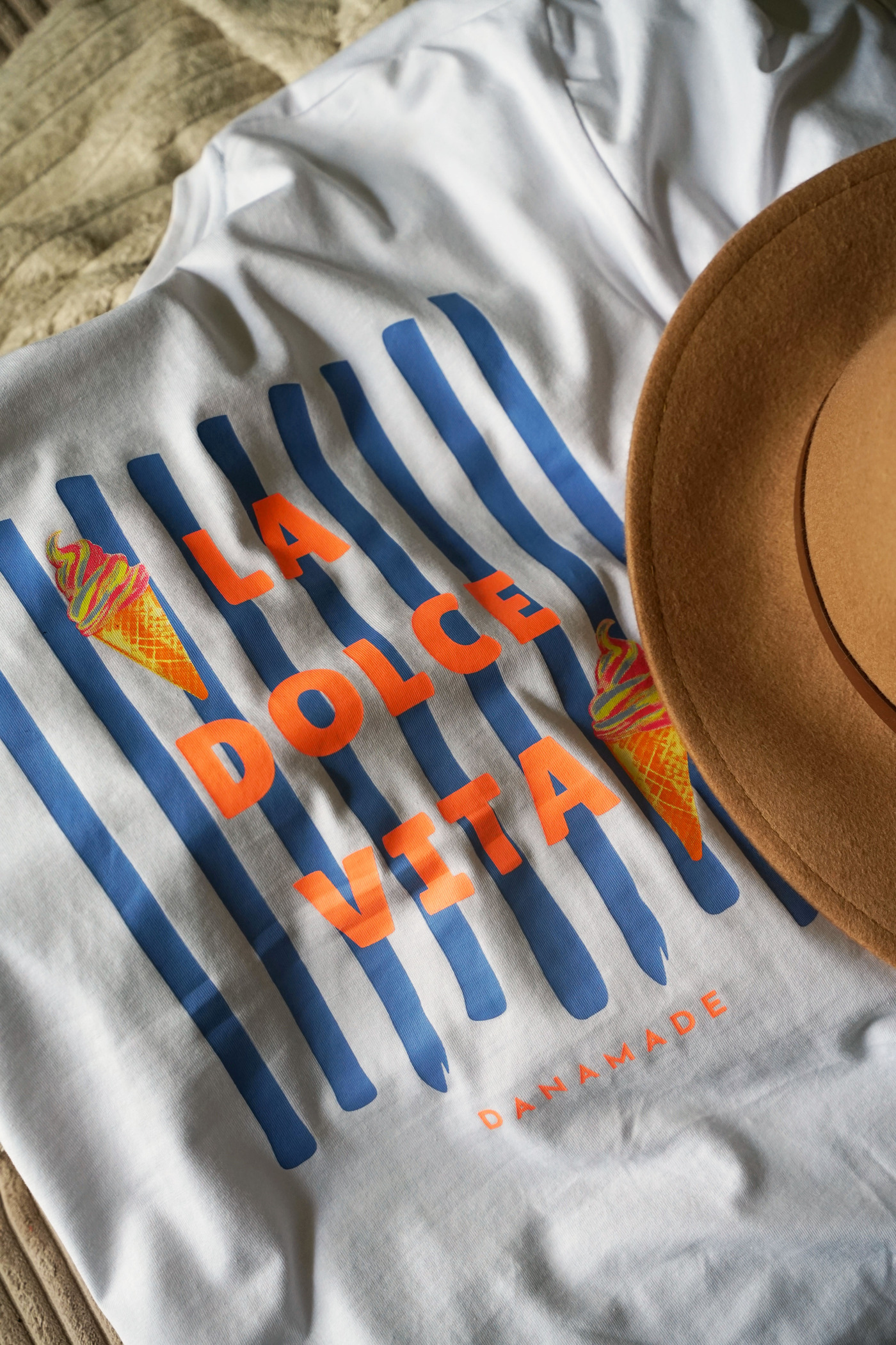 Es hat auf der Vorderseite auf Brusthöhe zwei Eis aufgedruckt und auf der Rückseite großflächig eine Grafik mit dem Worten "La Dolce Vita" für eine genussvolle, entspannte Lebensart. 🍦