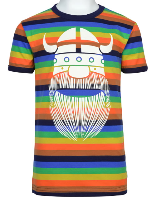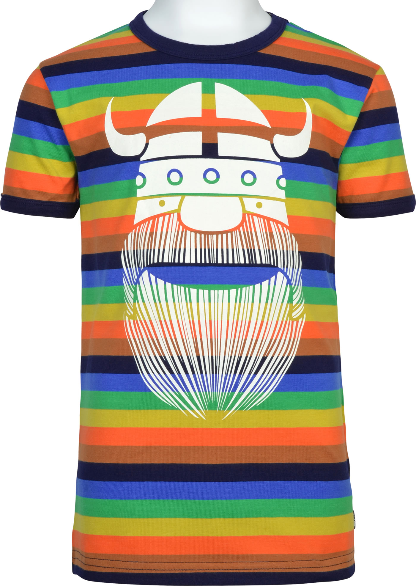 Kurzarm-Shirt von DANEFAE in bunt gestreift mit Wikinger Erik auf der Vorderseite. Das weiche Material sorgt für einen angenehmen Tragekomfort.