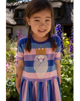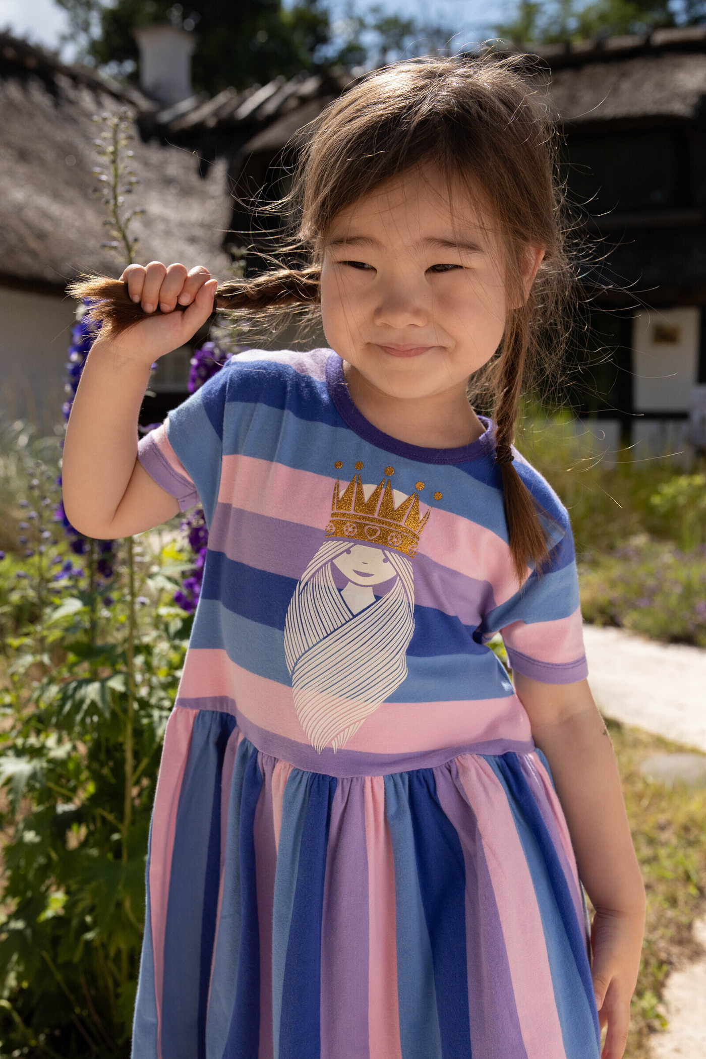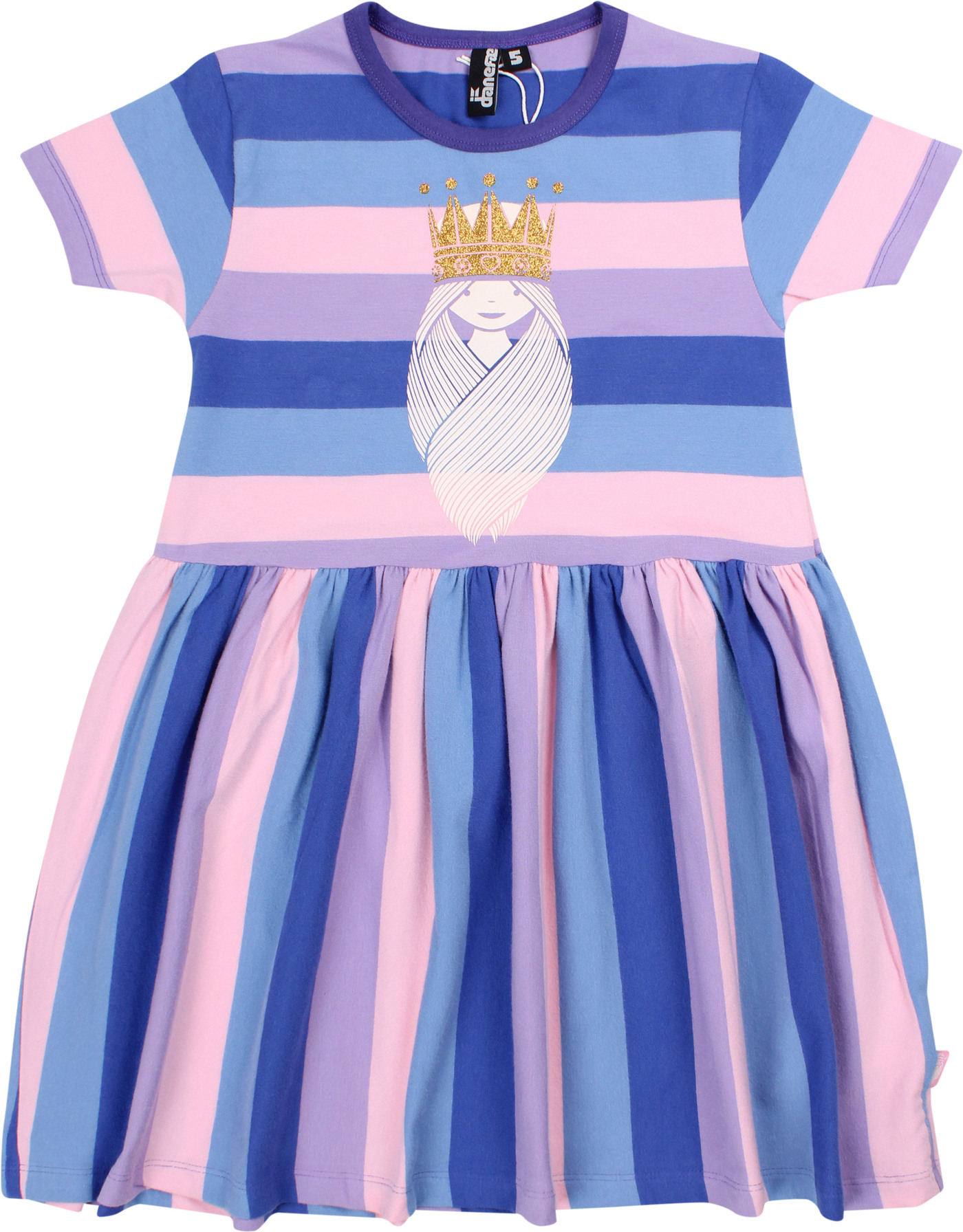 Hübsches Jersey-Kleid im farbenfrohen Streifen-Design mit kurzen Ärmeln von DANEFAE. Auf der Vorderseite befindet sich ein cooler Print, der Prinzessin. In der Taille ist ein Gummibund. Das gestreifte Kleid ist ein toller Blickfang und wird schnell ein Lieblingsteil im Kleiderschrank. Das weiche und elastische Material sorgt für einen hohen Tragekomfort.