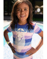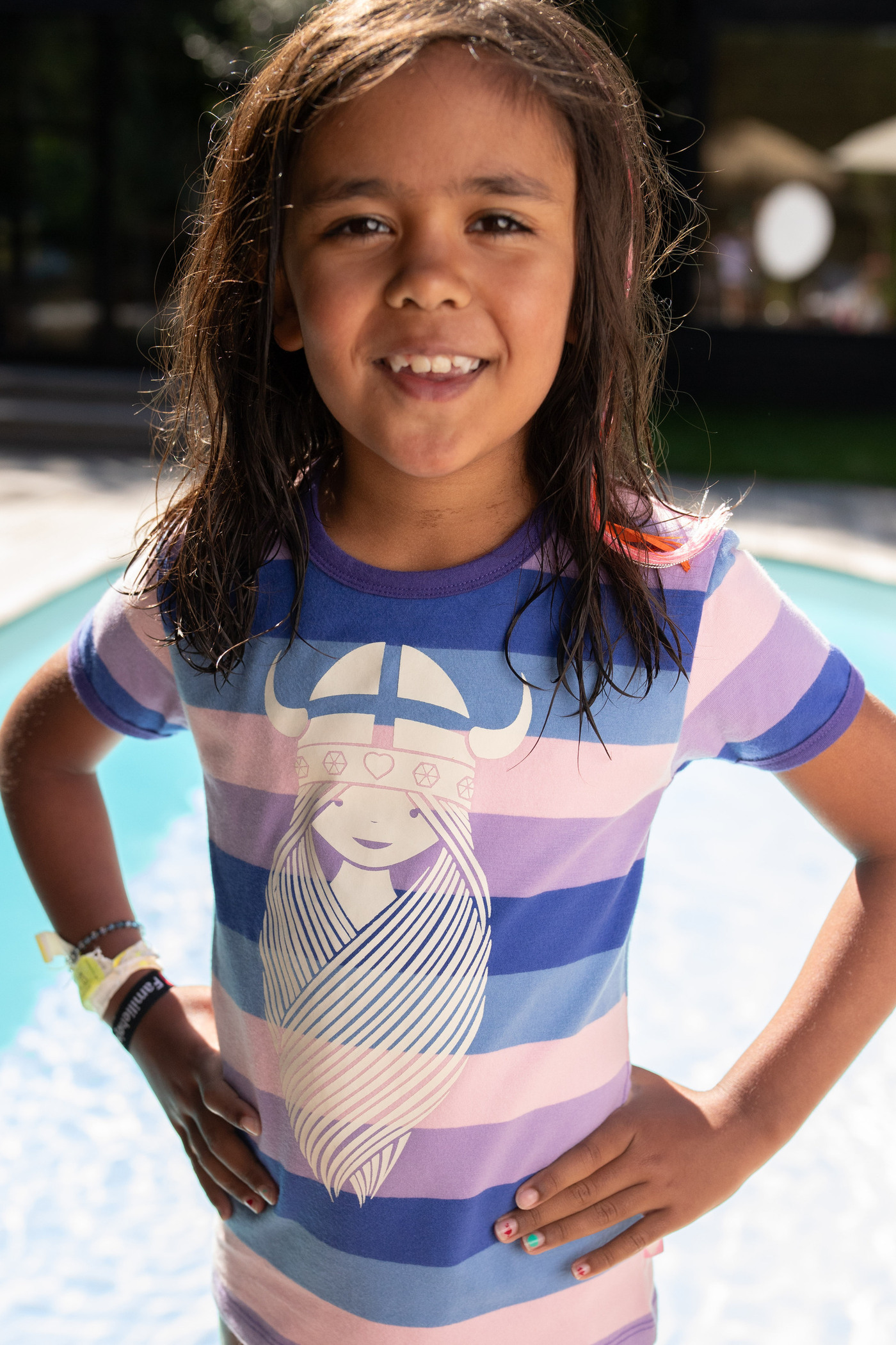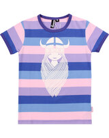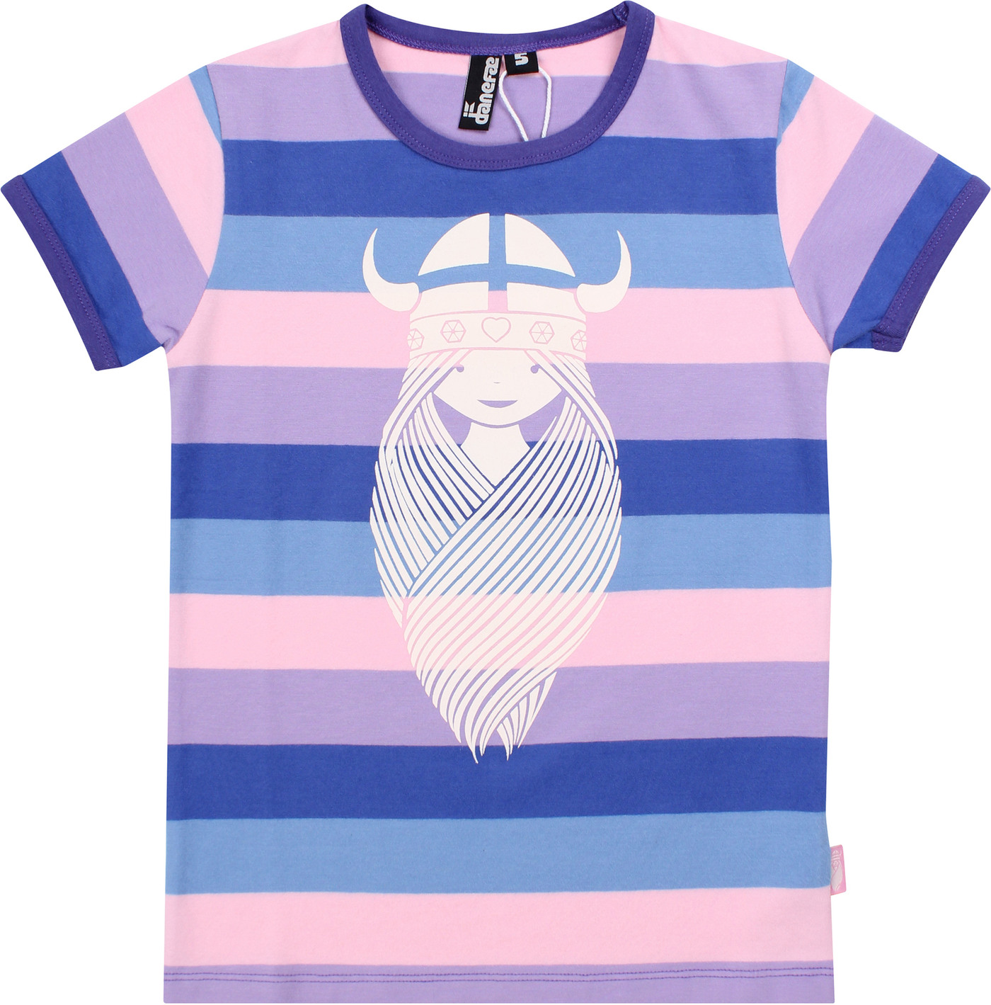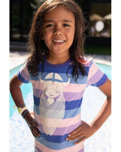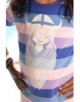 Hochwertiges T-Shirt im bunten Streifen-Design mit kurzen Ärmeln für Mädchen von DANEFAE. Auf der Vorderseite befindet sich ein cooler Print der Winkinger-Prinzessin Freja. Das weiche und elastische Material sorgt für einen hohen Tragekomfort.