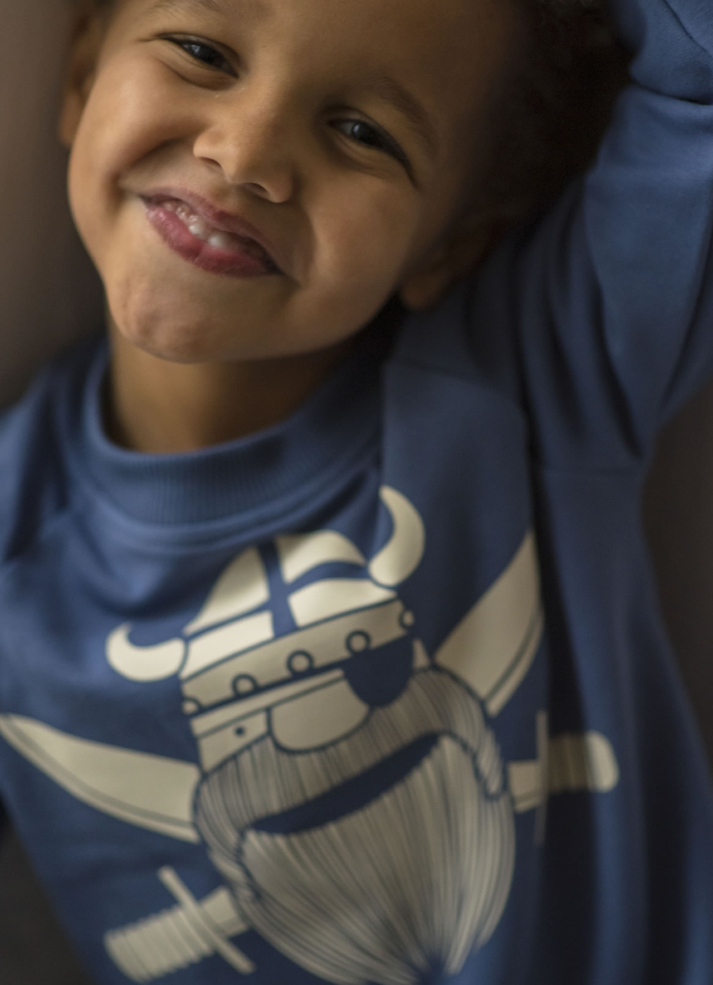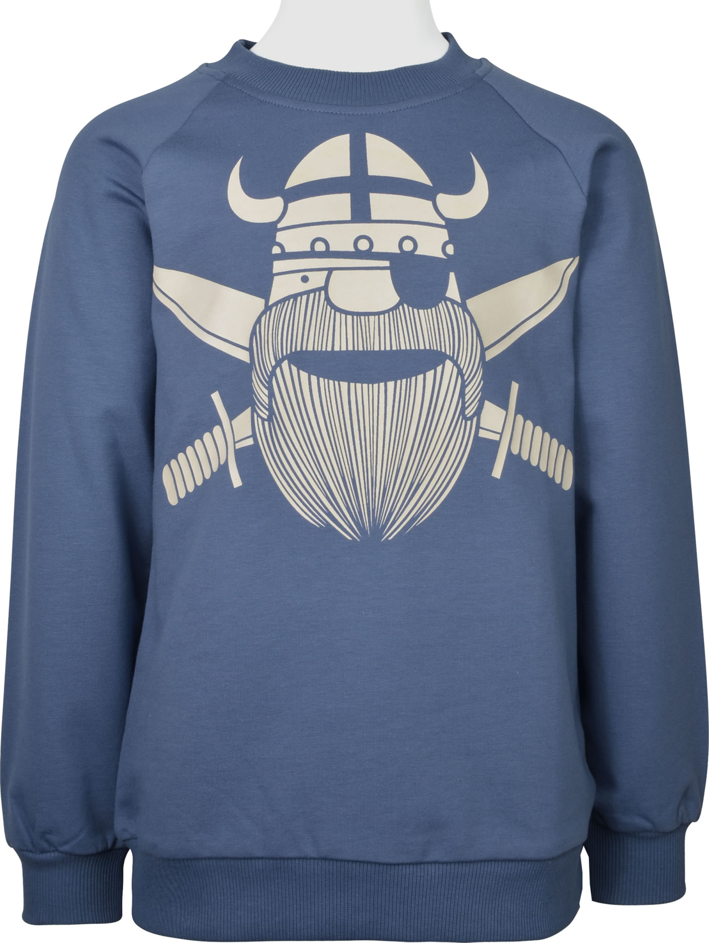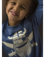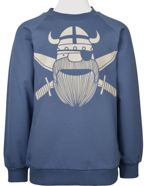 Hochwertig verarbeitetes Sweatshirt in blau von DANEFAE mit dem Piraten-Wikinger Erik auf der Vorderseite. Das Sweatshirt ist von innen kuschelig weich angeraut, so hält es an kühleren Tagen schön warm.