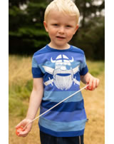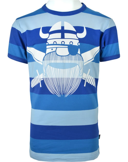 Hochwertiges Kurzarm-Shirt in blau geringelt und mit tollem Print vom Wikinger Erik als Pirat auf der Vorderseite von DANEFAE. Das weiche und elastische Material sorgt für einen hohen Tragekomfort.