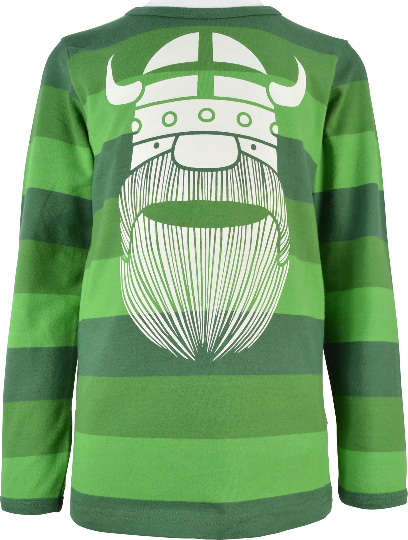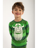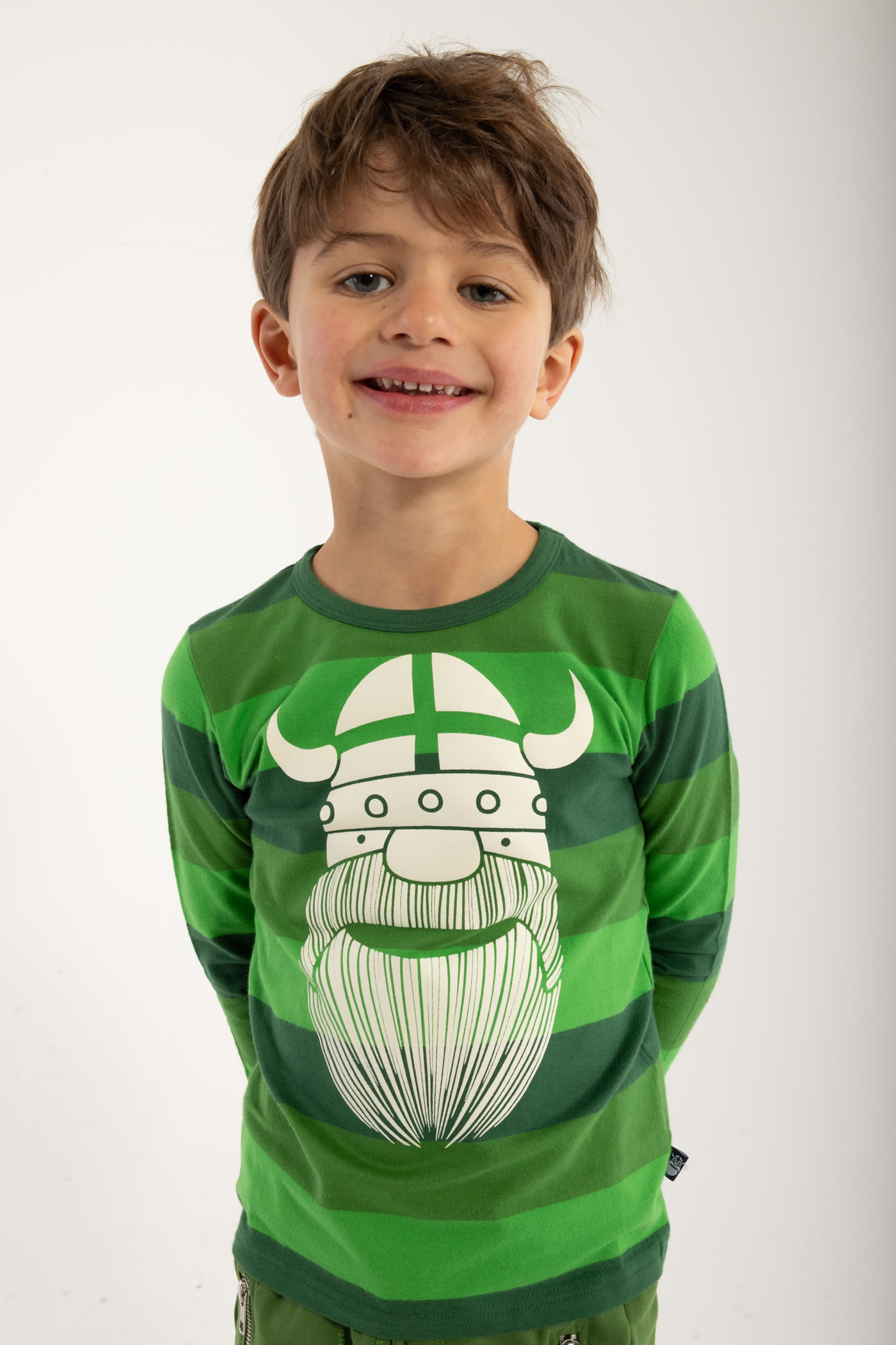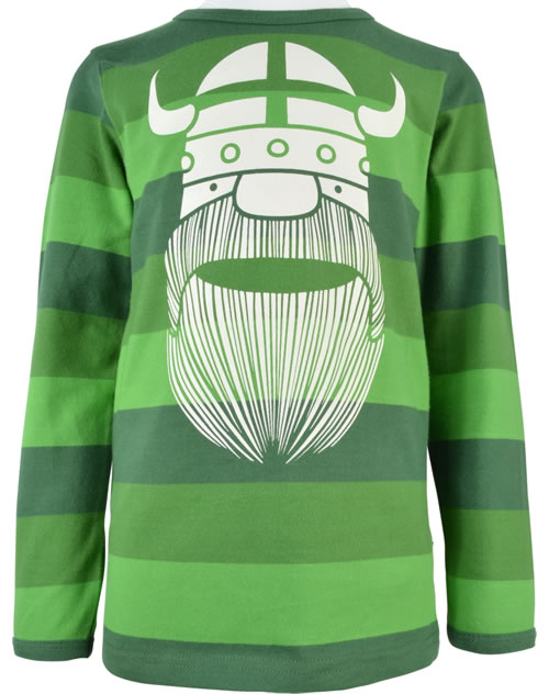 Dieses tolle Langarm-Shirt von DANEFAE in grün gestreift ist ein toller Begleiter für kühle Tage. Auf der Vorderseite des Shirts befindet sich der Wikinger Erik in weiß. Das Material ist weich angeraut und sorgt damit für einen hohen Tragekomfort.