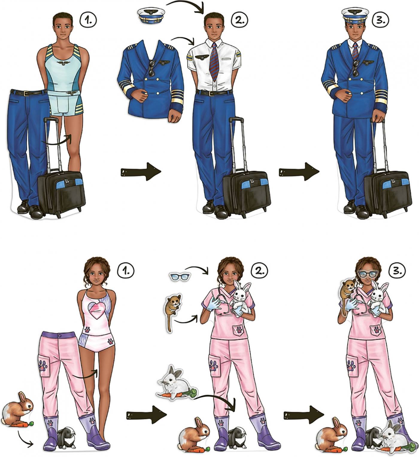 Feuerwehrmann, Tierärztin, Bäcker, Polizistin, Astronautin, Schornsteinfeger und noch so viel mehr: In Dress me up Jobs kann man sich auf 24 Seiten und mit 11 Stickerbogen durch die spannende Welt der Berufe kleben. Viel Spaß bei der Arbeit!