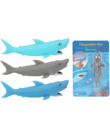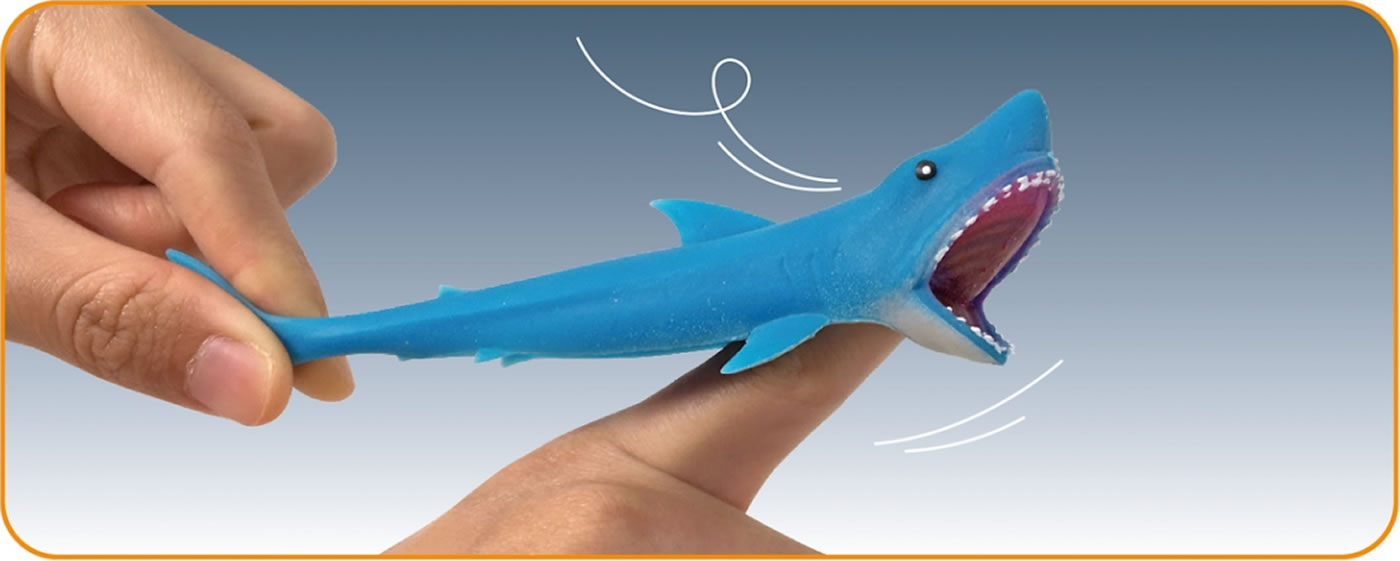 Die weiche Haifigur funktioniert wie eine Zwille: über den Finger spannen und fliegen lassen! Cool: Sie bleiben kurz auf glatten Flächen kleben.
