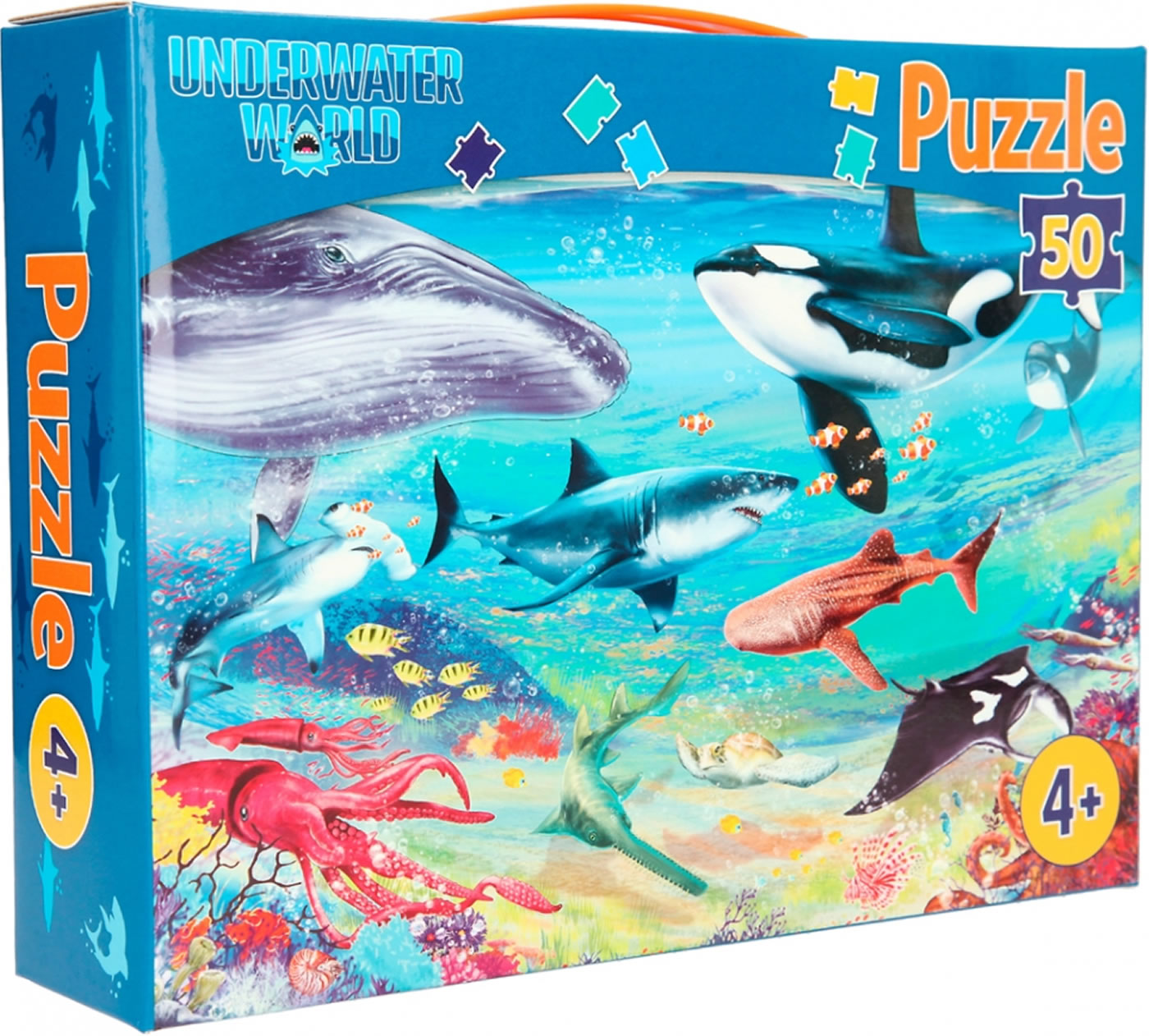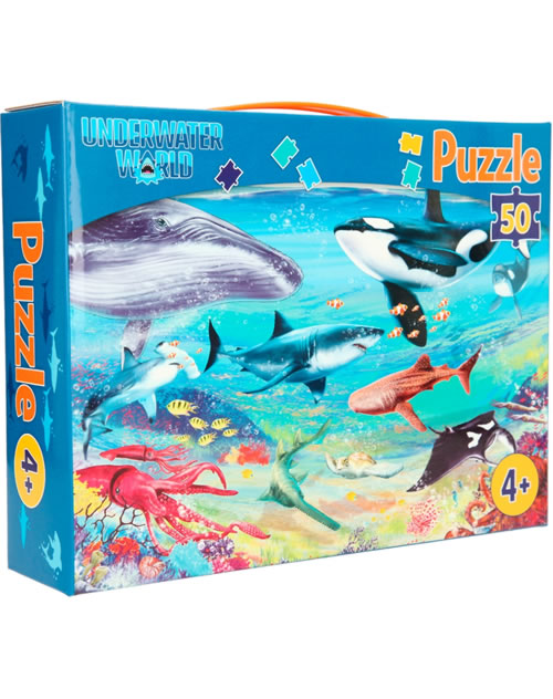 Puzzle dich in die Tiefen des Meeres: Das 50-teilige Puzzle zeigt viele spannende Meeresbewohner und hat fertig gepuzzelt eine Größe von 58x40 cm. Verpackt sind die Teile in einer Schachtel in Kofferform mit praktischem Tragegriff.