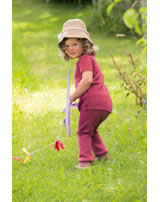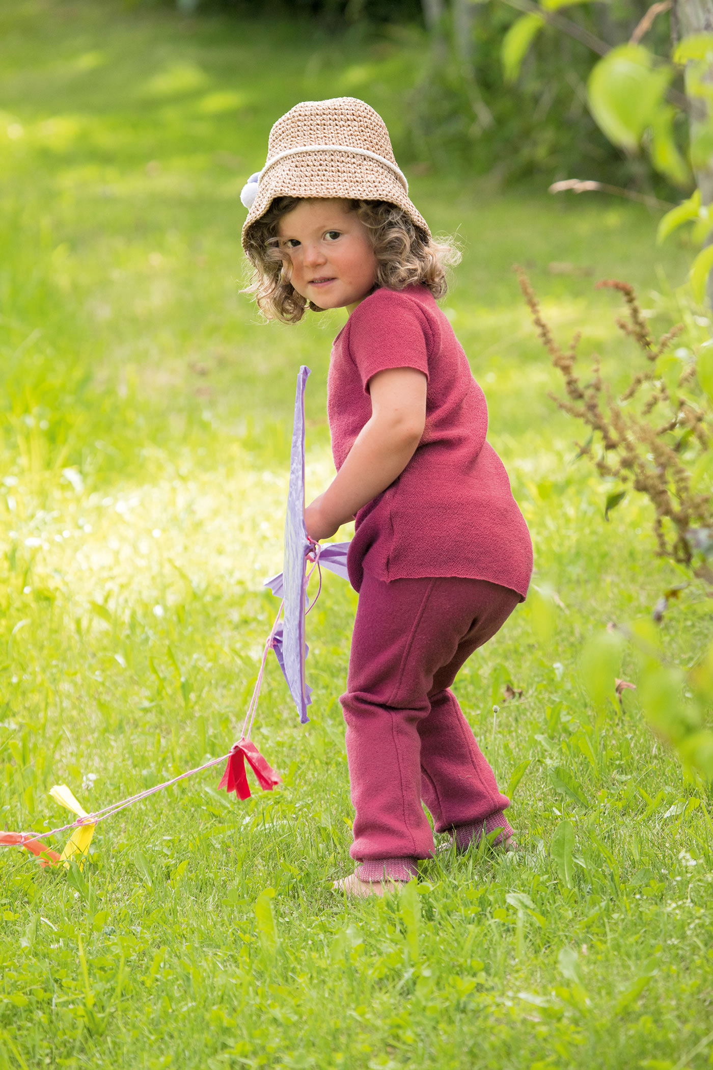 Sehr bequeme und hochwertige Sommer-Walkhose aus Schurwolle für Babys und Kleinkinder von DISANA. Das Material unterstützt ein gesundes Hautklima. Mit breiten Rippbündchen an Bauch und den Fußenden.