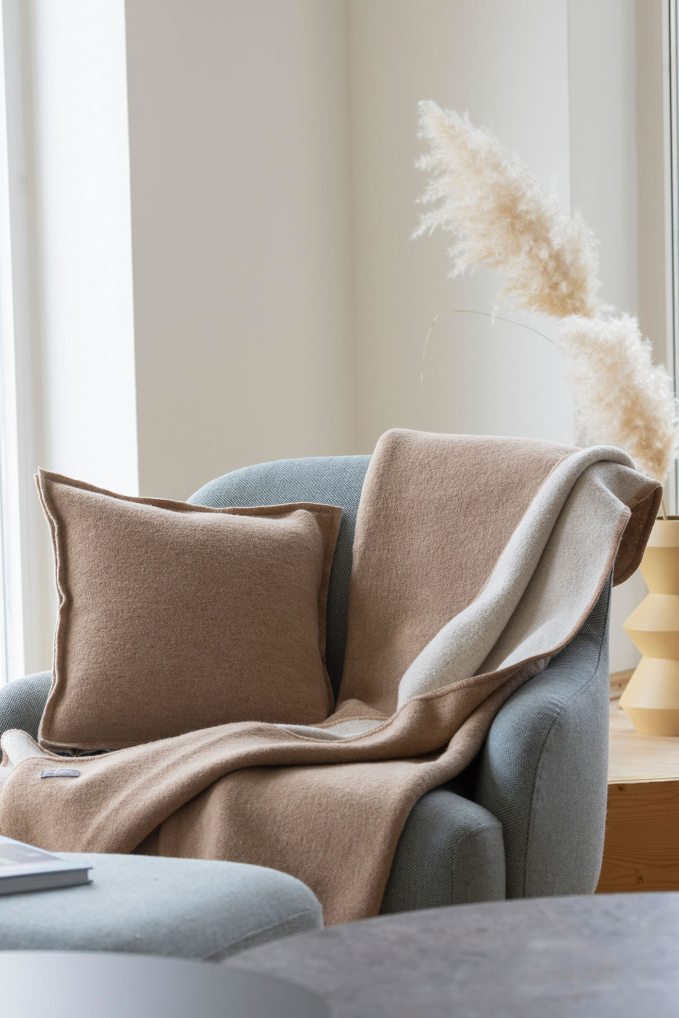 Hochwertige und warme Decke aus gewalkter Merino-Schurwolle von DISANA. Die Decke spendet behagliche Wärme und wirkt temperaturausgleichend. Besonders schön ist das Spiel mit den unterschiedlichen Farben auf Vorder- und Rückseite. Naturbelassene Merino-Schurwolle zeichnet sich durch ihre besondere Feinheit aus, ist wunderbar weich und angenehm auf der Haut. DISANA Merino-Wolle kratzt nicht. Sie verschmutzt kaum und gleicht Temperaturen gut aus. DISANA Merino-Schurwolle ist "Mulesing frei".