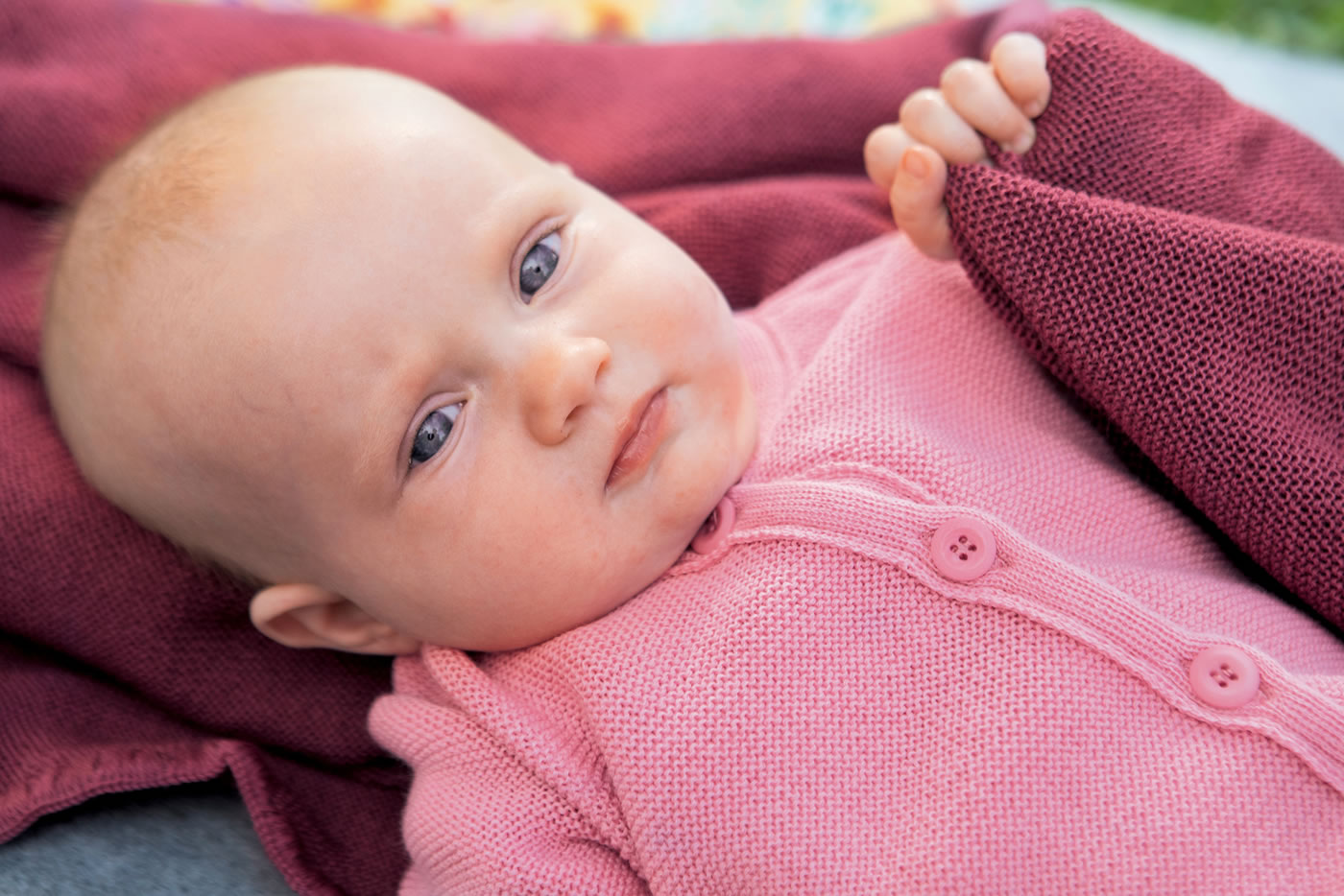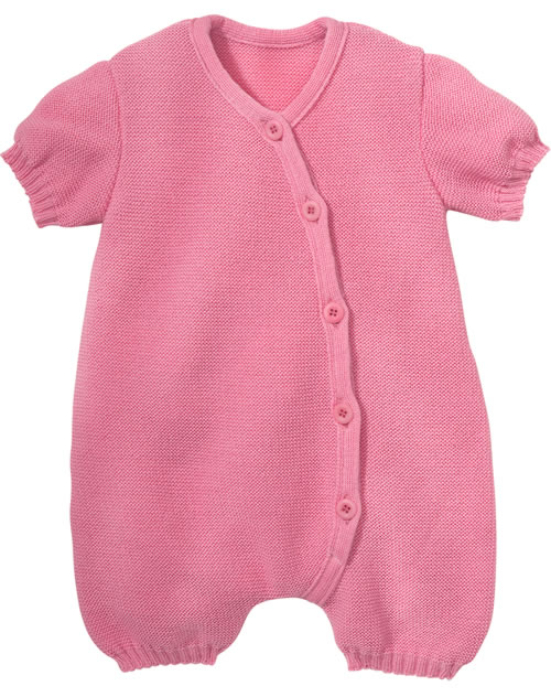 Edler Strick-Spieler aus feiner Merinowolle mit kurzen Armen und Beinen von DISANA. Die die durchgehende Knopfleiste auf der Vorderseite machen das An-und Ausziehen zu einem Kinderspiel.