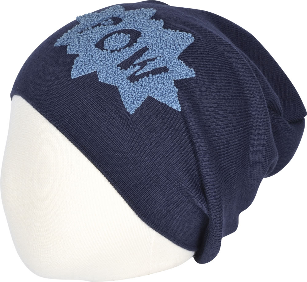 Angesagte Strick-Mütze in dunkelblau von DÖLL mit Schiriftzug in hellblau auf der Vorderseite.