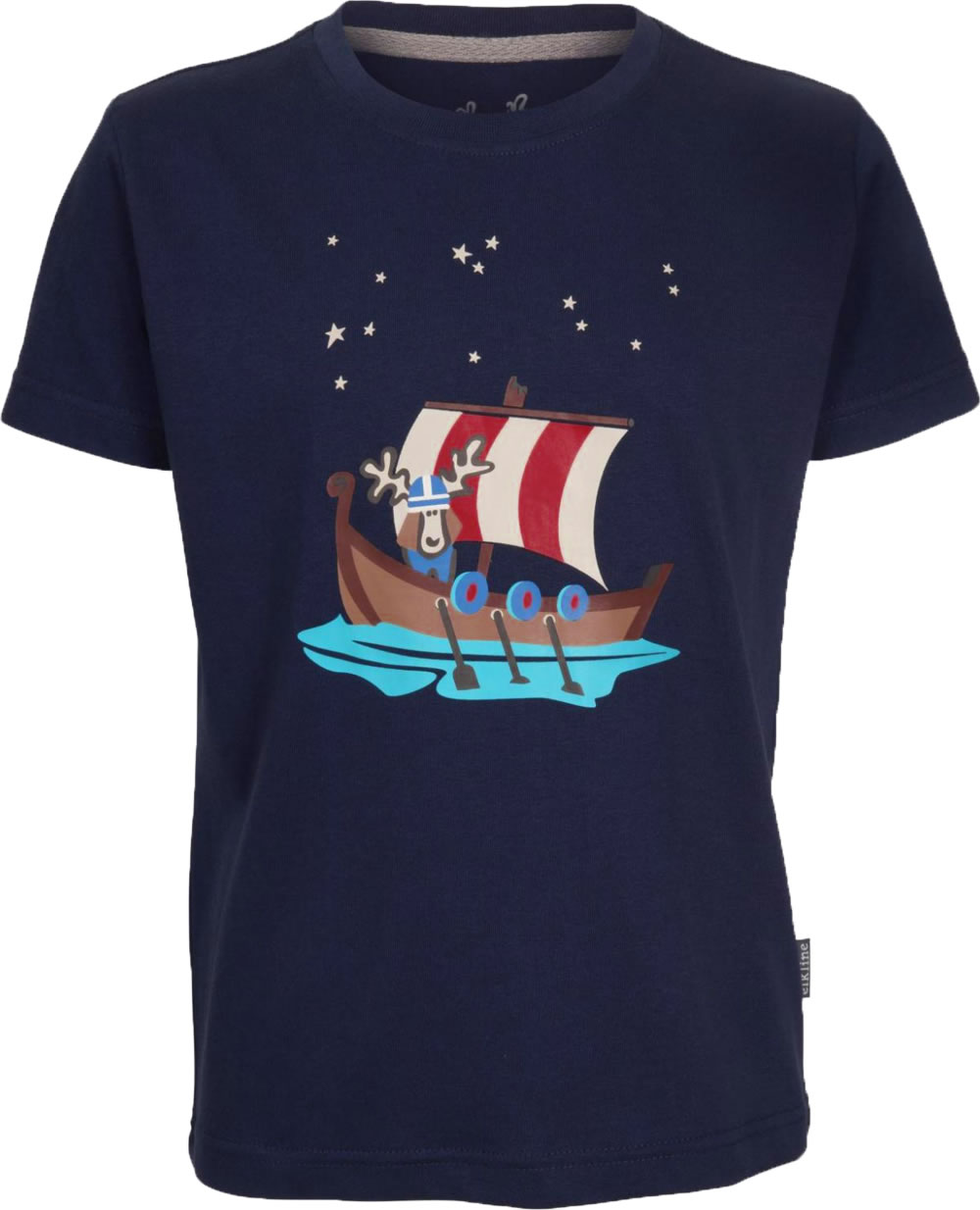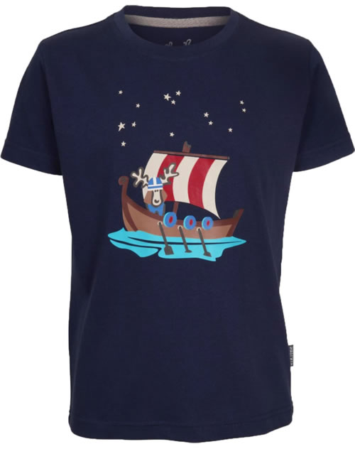 Tolles Kurzarm-Shirt für Kinder mit Wikinger-Druck auf der Vorderseite. Das Wikinger-Schiff und der Elch sind ein echter Hingucker. Das weiche Material sorgt für einen angenehmen Tragekomfort.
