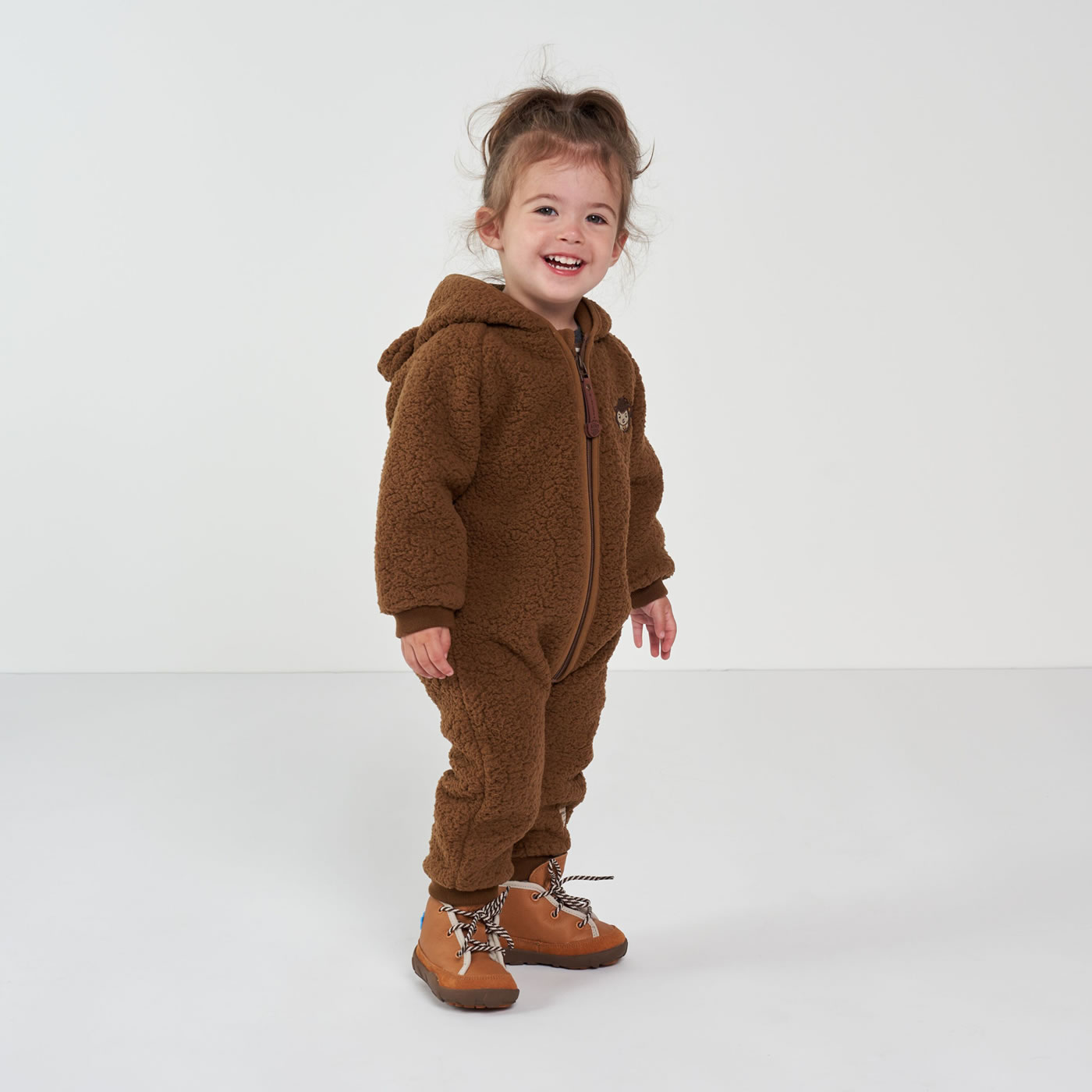 With the great fleece overall AMADEUS from the cooperation between AFFENZAHN and MINI A TURE, little explorers are not only cozy and warm but also stylishly dressed. Many small details such as the animal patch on the left breast or the lovingly crafted ears on the hood make the overall made of recycled teddy fleece an absolute eye-catcher.