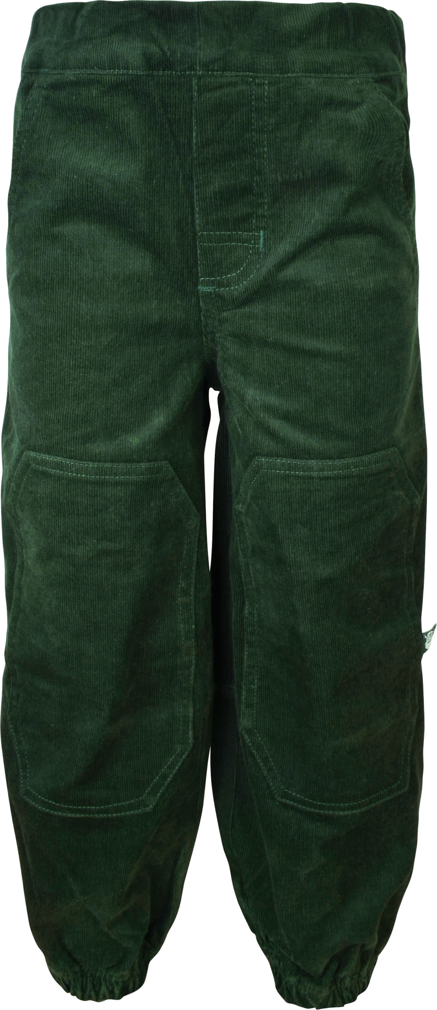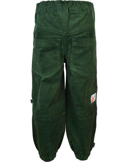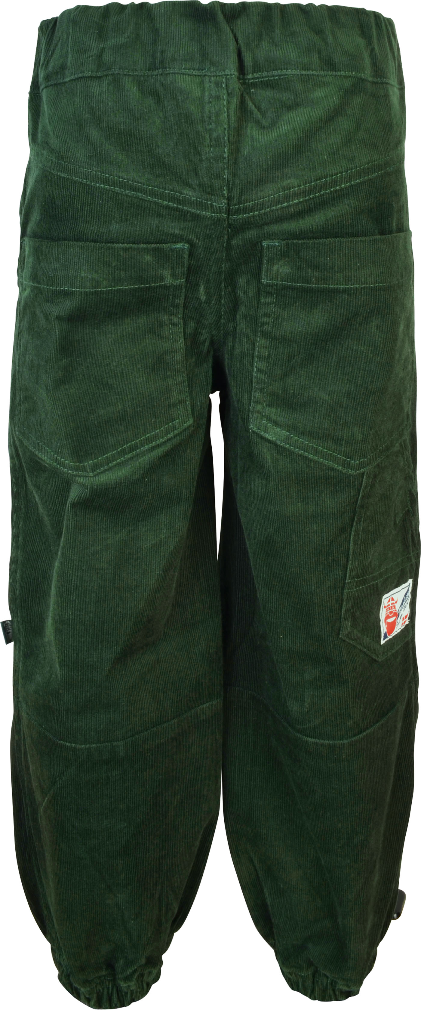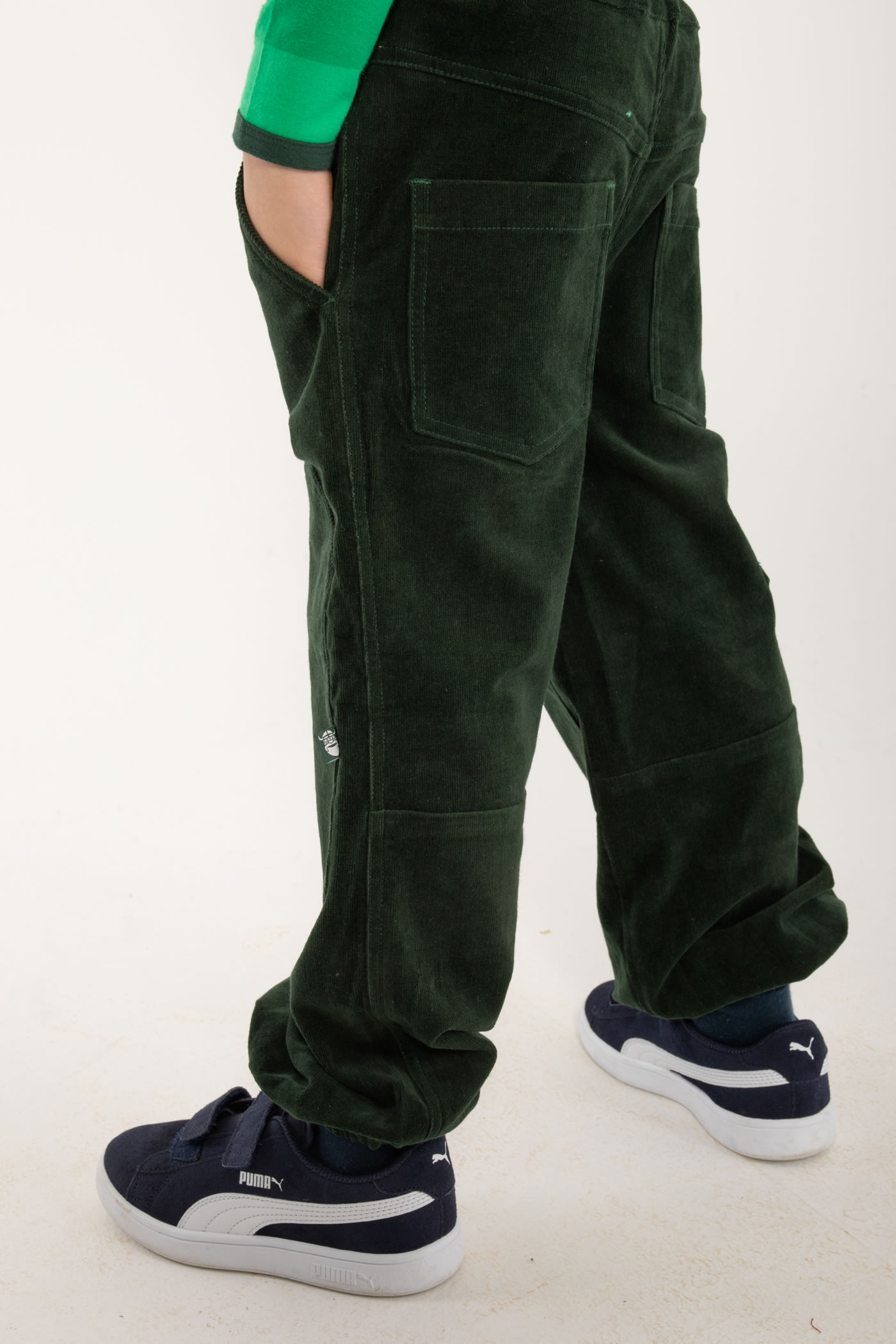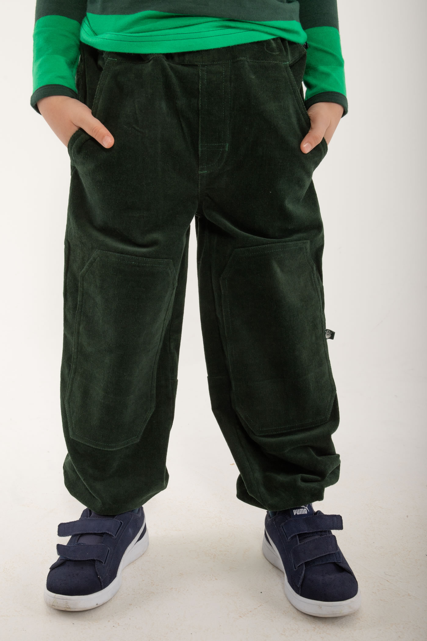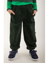 Wide leg cord trousers by DANEFAE for boys. Elastic cuffs at the waist and legs ensure a good fit. The width at the waist can also be adjusted. The comfortable trousers have two pockets at the front and two at the back. There is also a small pocket with Velcro closure on the back of the right leg. The robust cargo-style pants have reinforcements on the knees.