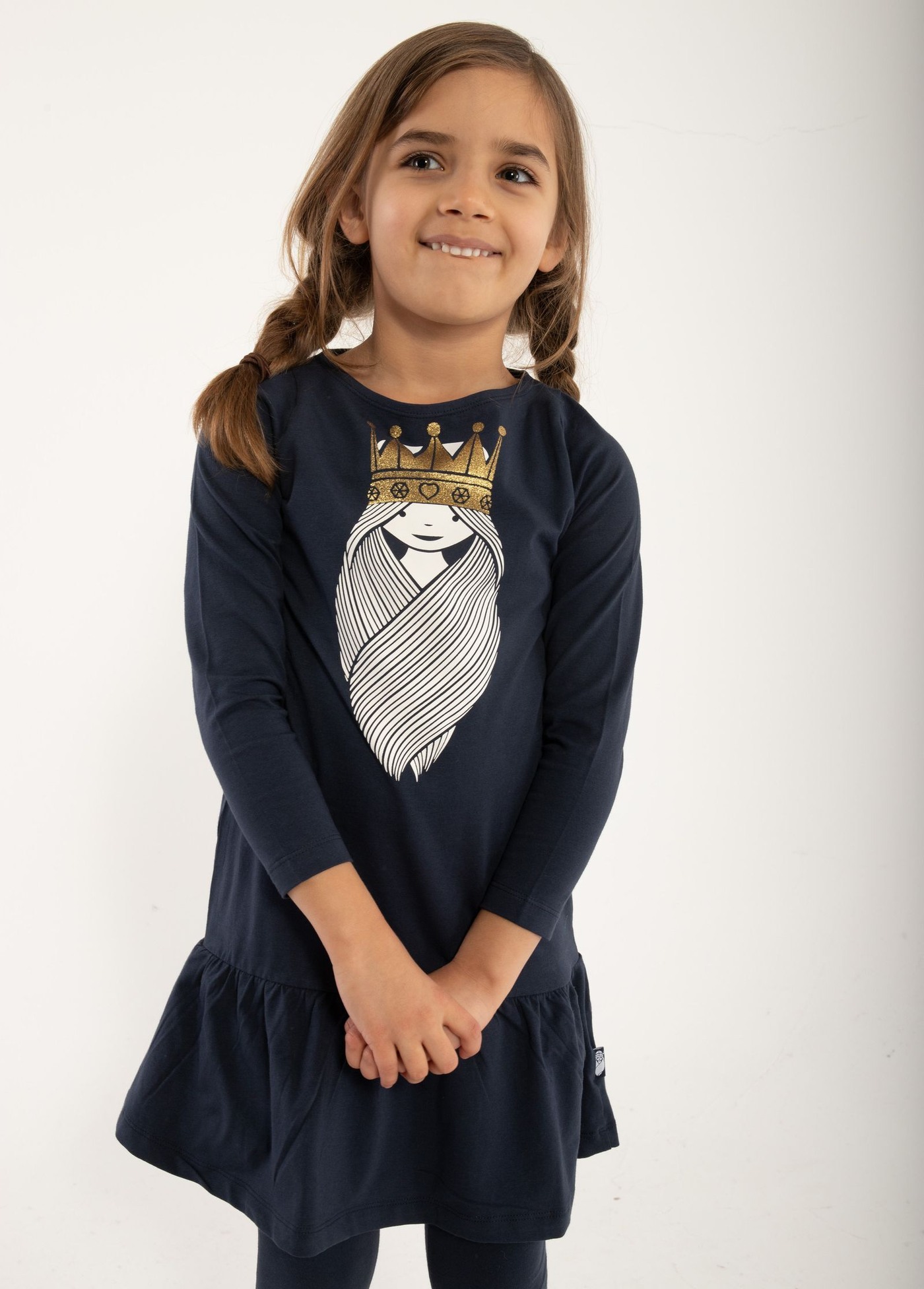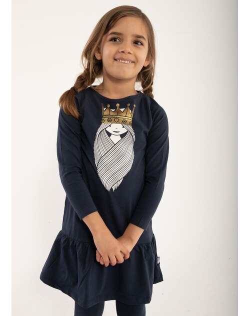 Beautiful jersey dress Danecookie with long sleeves in dark blue with by DANEFAE. Great details are the flounce and the Viking princess with a glittering gold crown on the front.