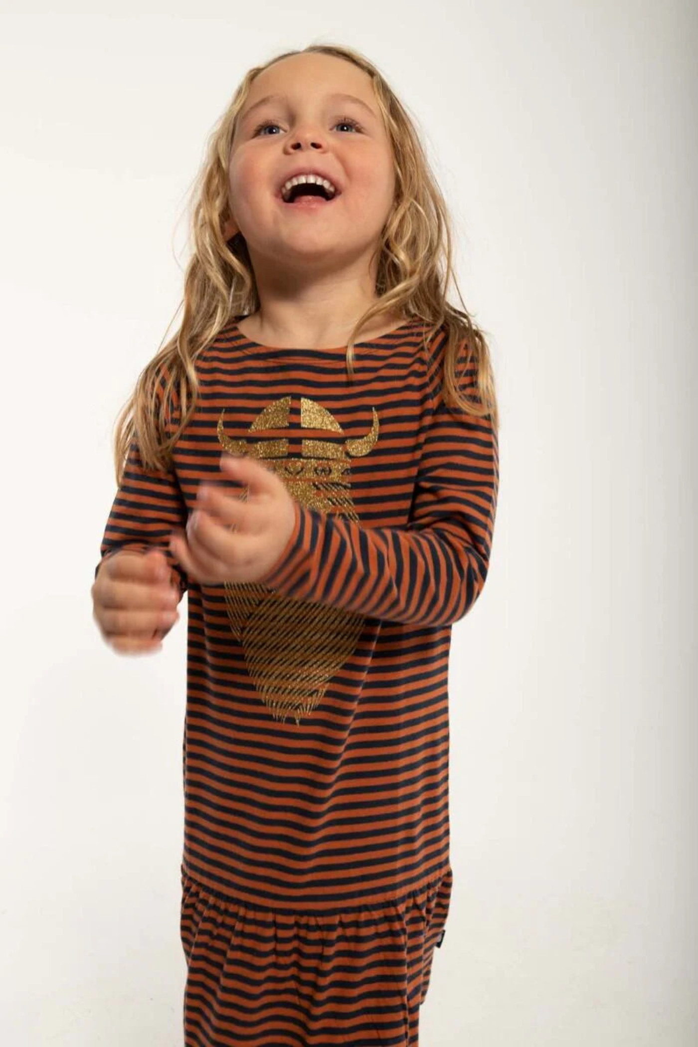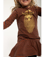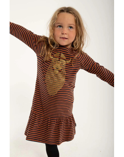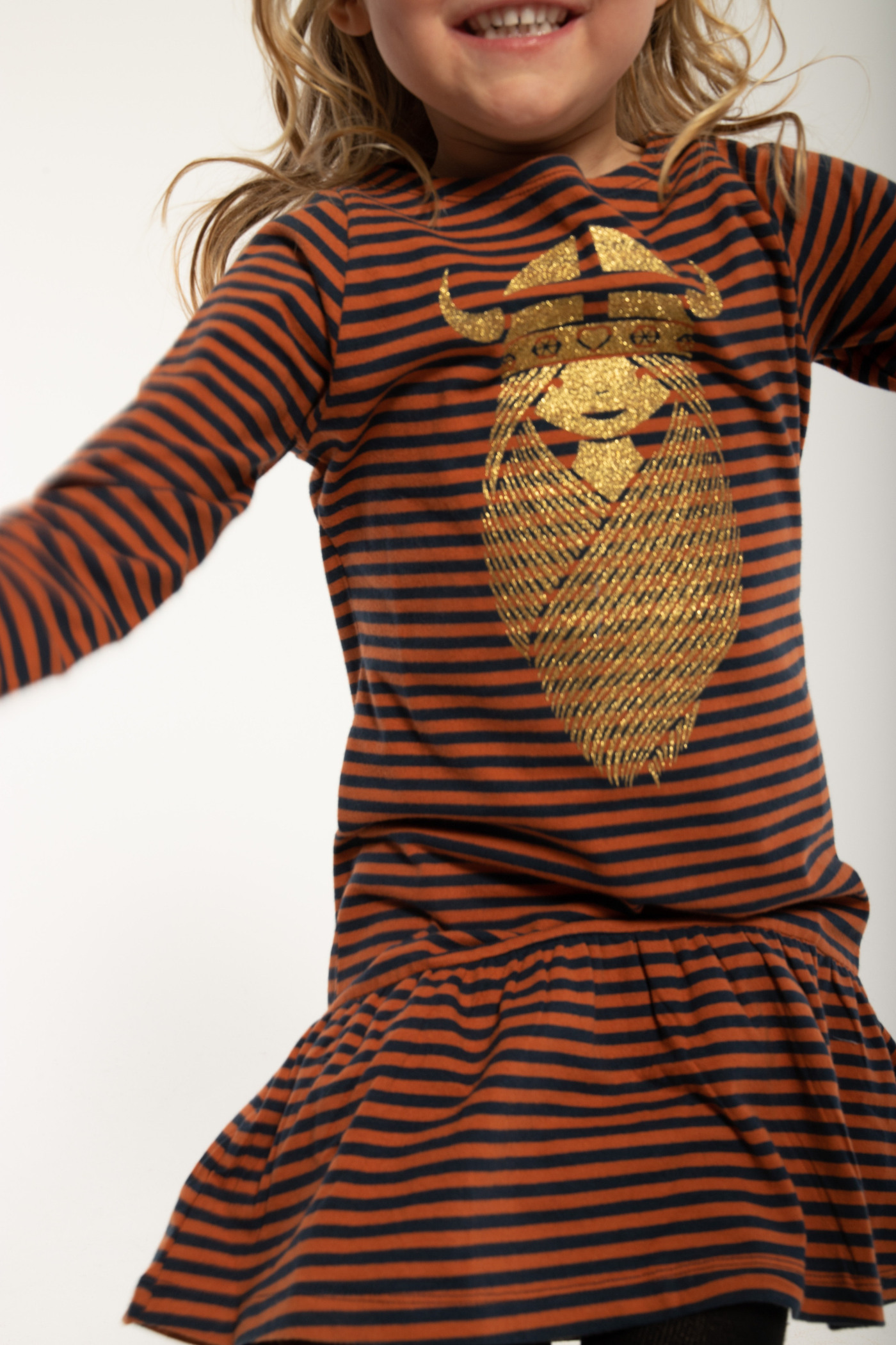 Striped jersey dress Danecookie with long sleeves from DANEFAE. Great details are the flounce and the Viking princess with a glittering gold crown on the front. The fabric is softly roughened and therefore cozy and warm.