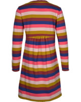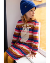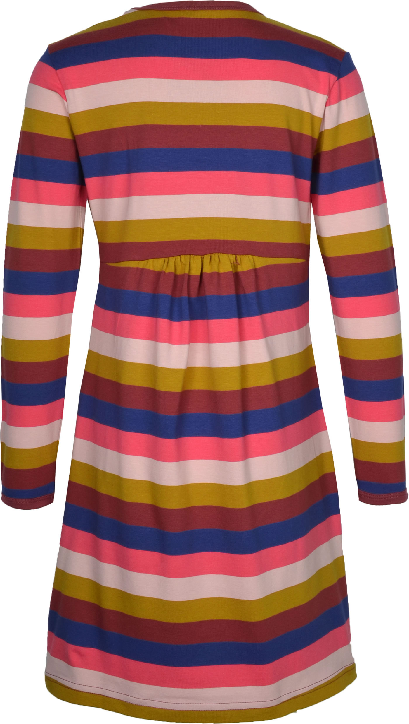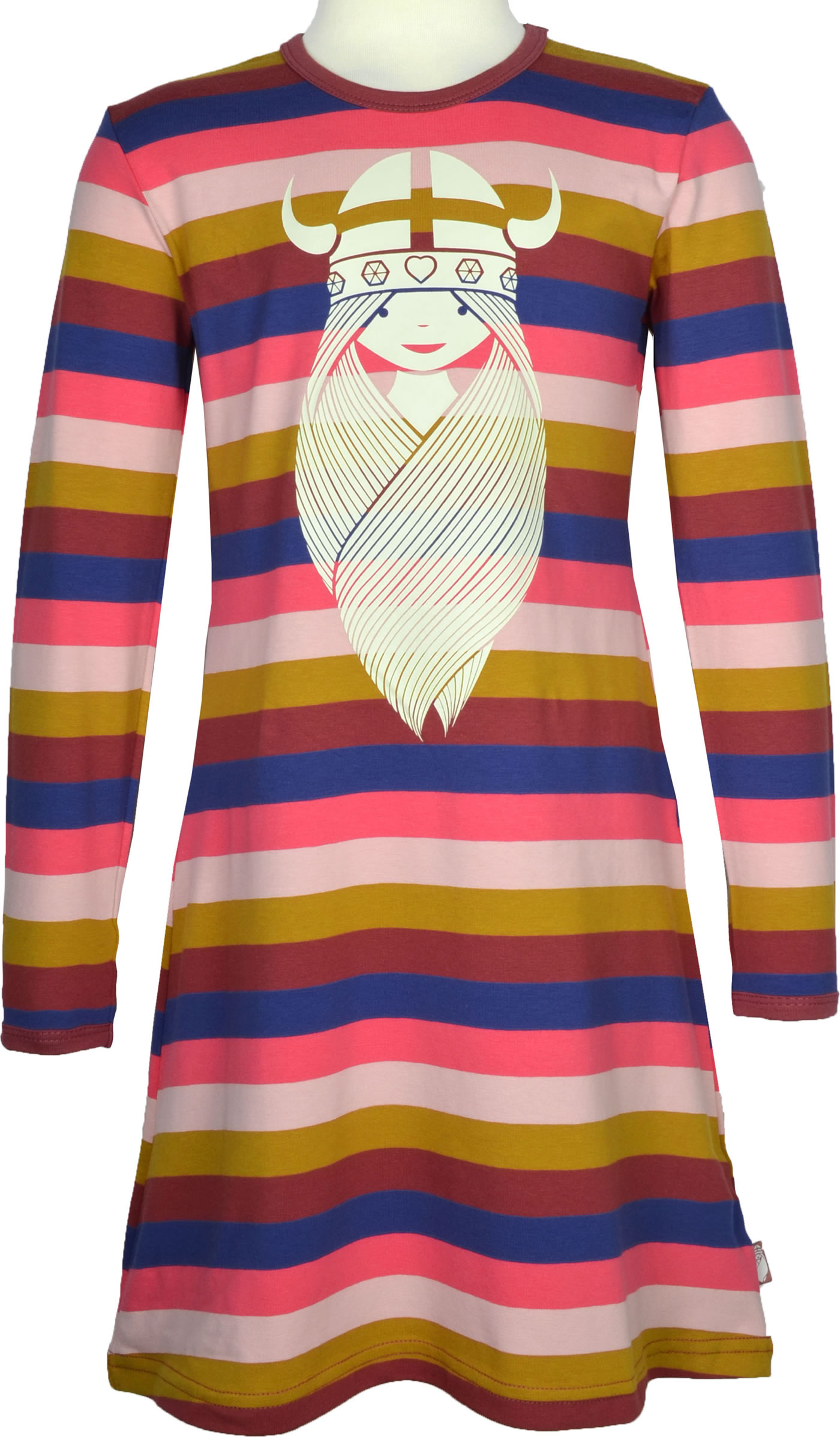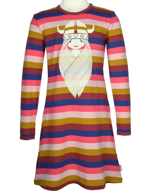 Cheerful striped jersey dress Nanna with long sleeves by DANEFAE with a Freja portrait as a front print. There is an elastic waistband in the back. The striped dress with the Viking princess Freja is a great eye-catcher.