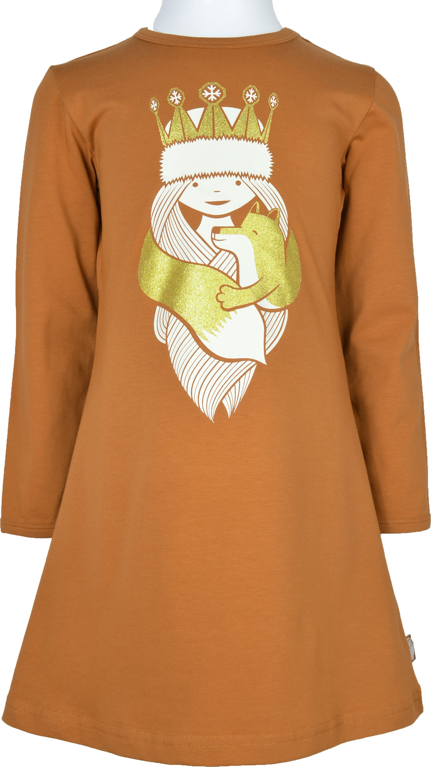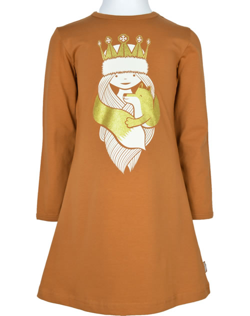 Pretty jersey dress Nanna with long sleeves by DANEFAE. On the back there are small darts at the waist, which ensure a perfect fit. A real eye-catcher is the snow princess on the front with glitter print and a small fox in her arms.