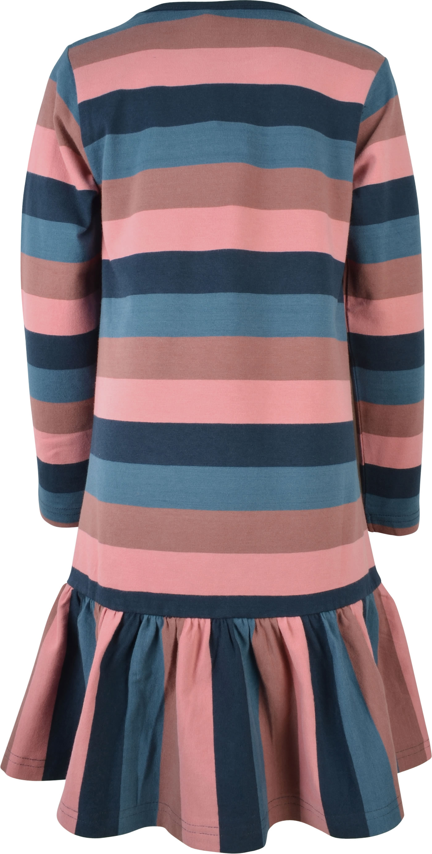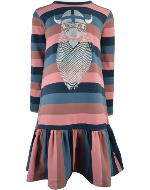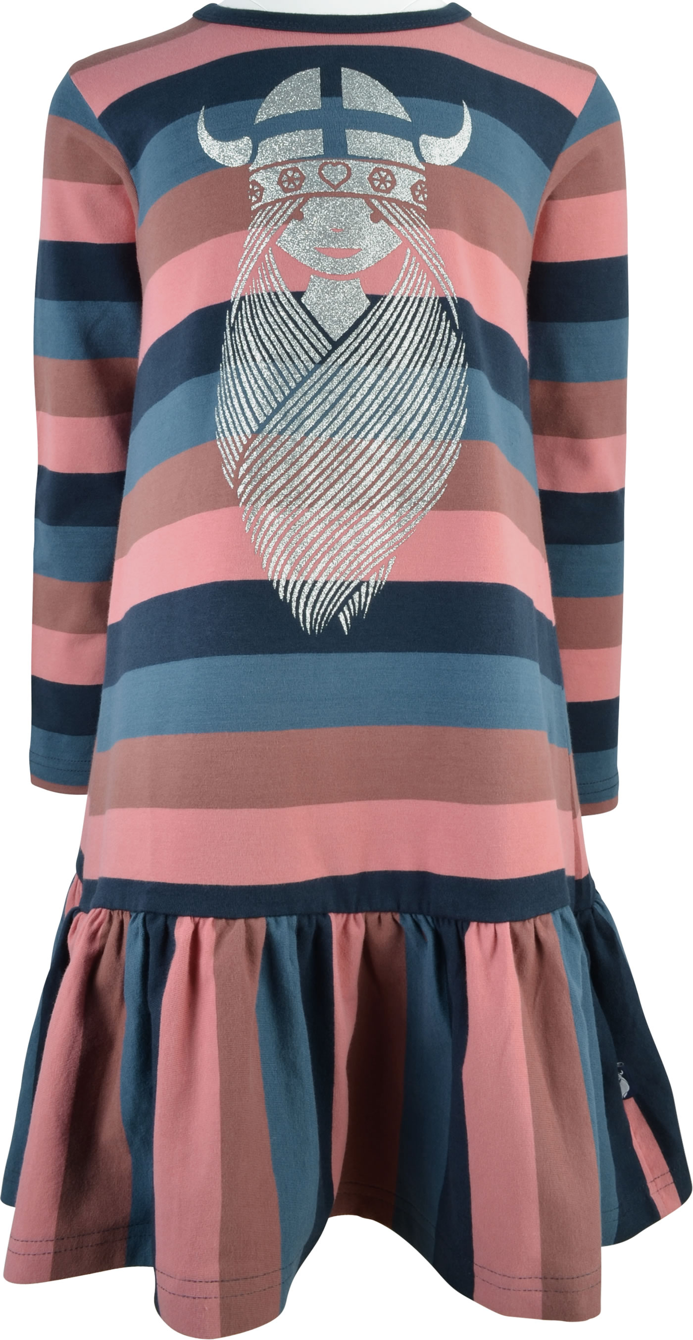 Striped jersey dress by DANEFAE. Beautiful details are the silver glittering Viking princess on the front and the flounce. The dress has a loose cut and can be perfectly combined with leggings or tights.