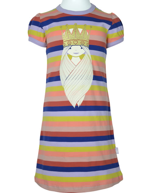 Striped jersey dress with short sleeves from DANEFAE. On the front, the Viking princess Freja enchants with a glittering gold crown. Another pretty detail are the gathered sleeves. The pleasant material offers a high wearing comfort.
