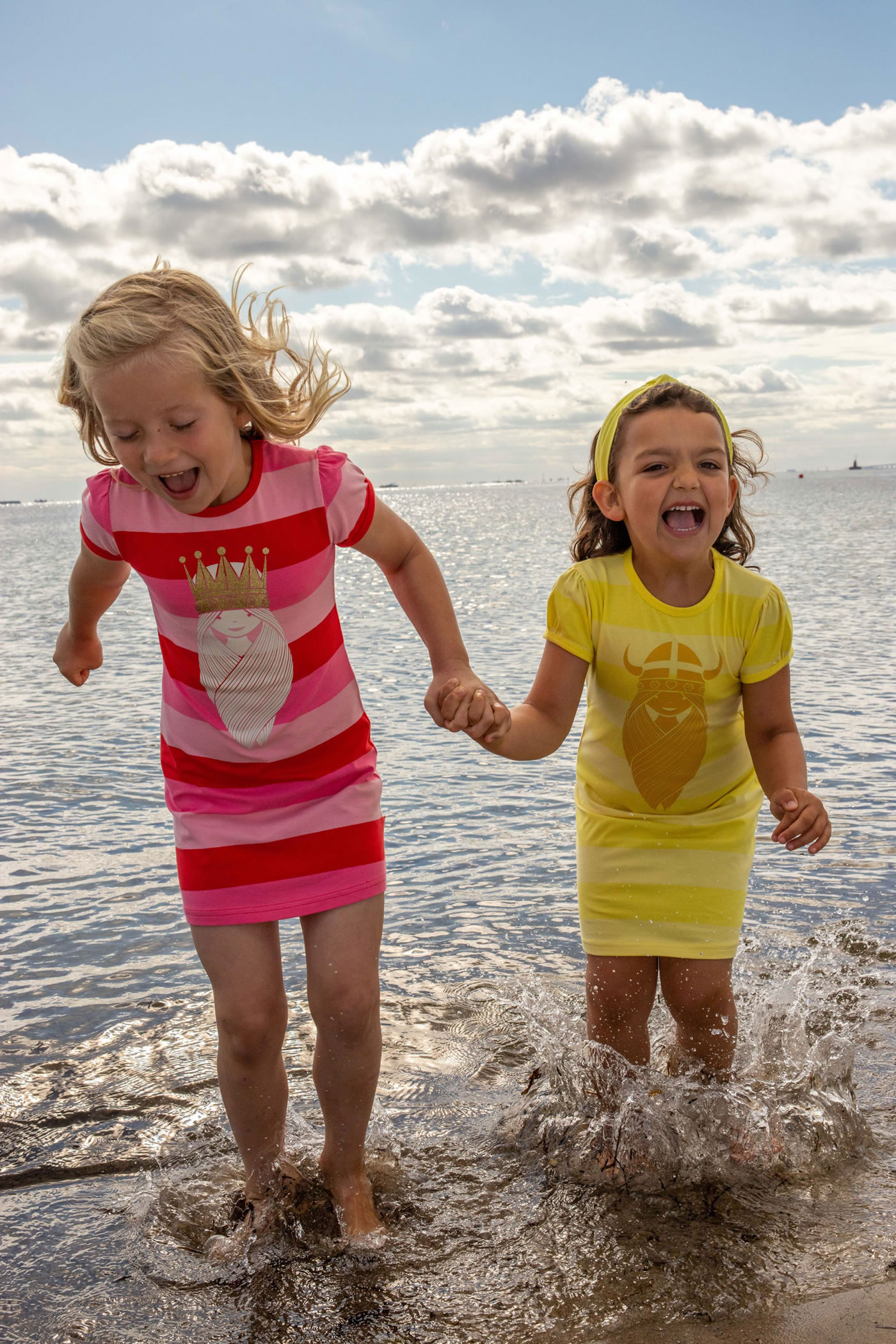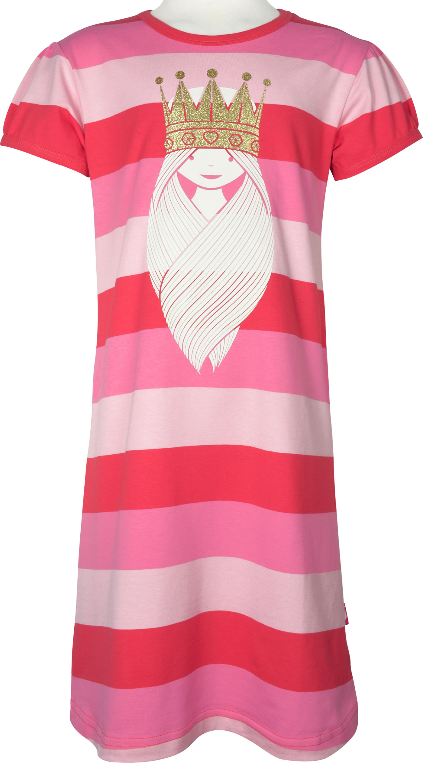 Striped jersey dress with short sleeves by DANEFAE. On the front, the Viking princess Freja enchants with a glittering crown. Another nice detail are the gathered sleeves. The pleasant material offers a high level of comfort.