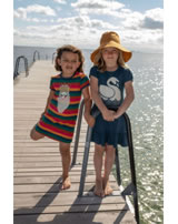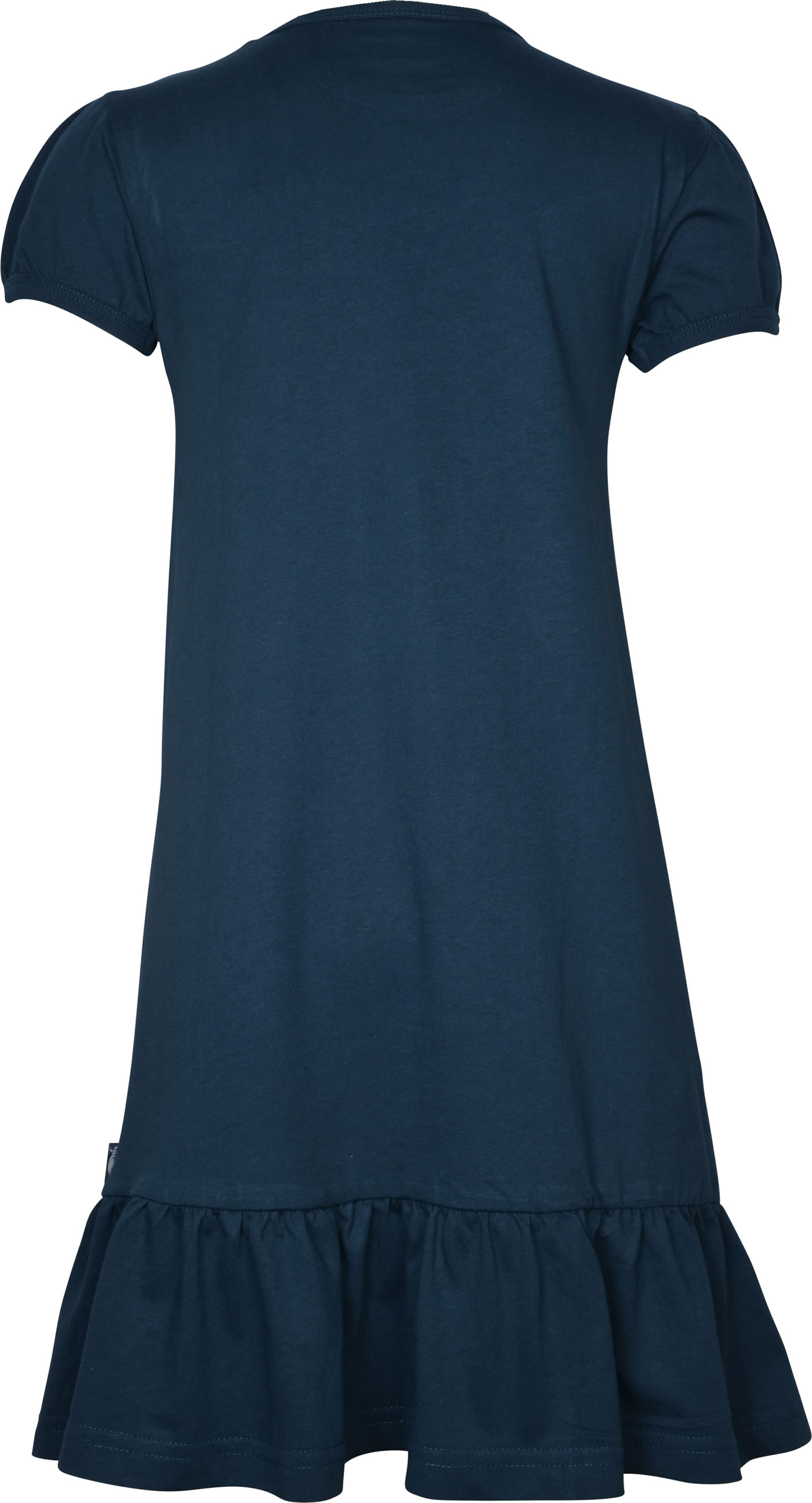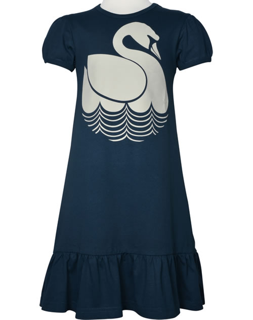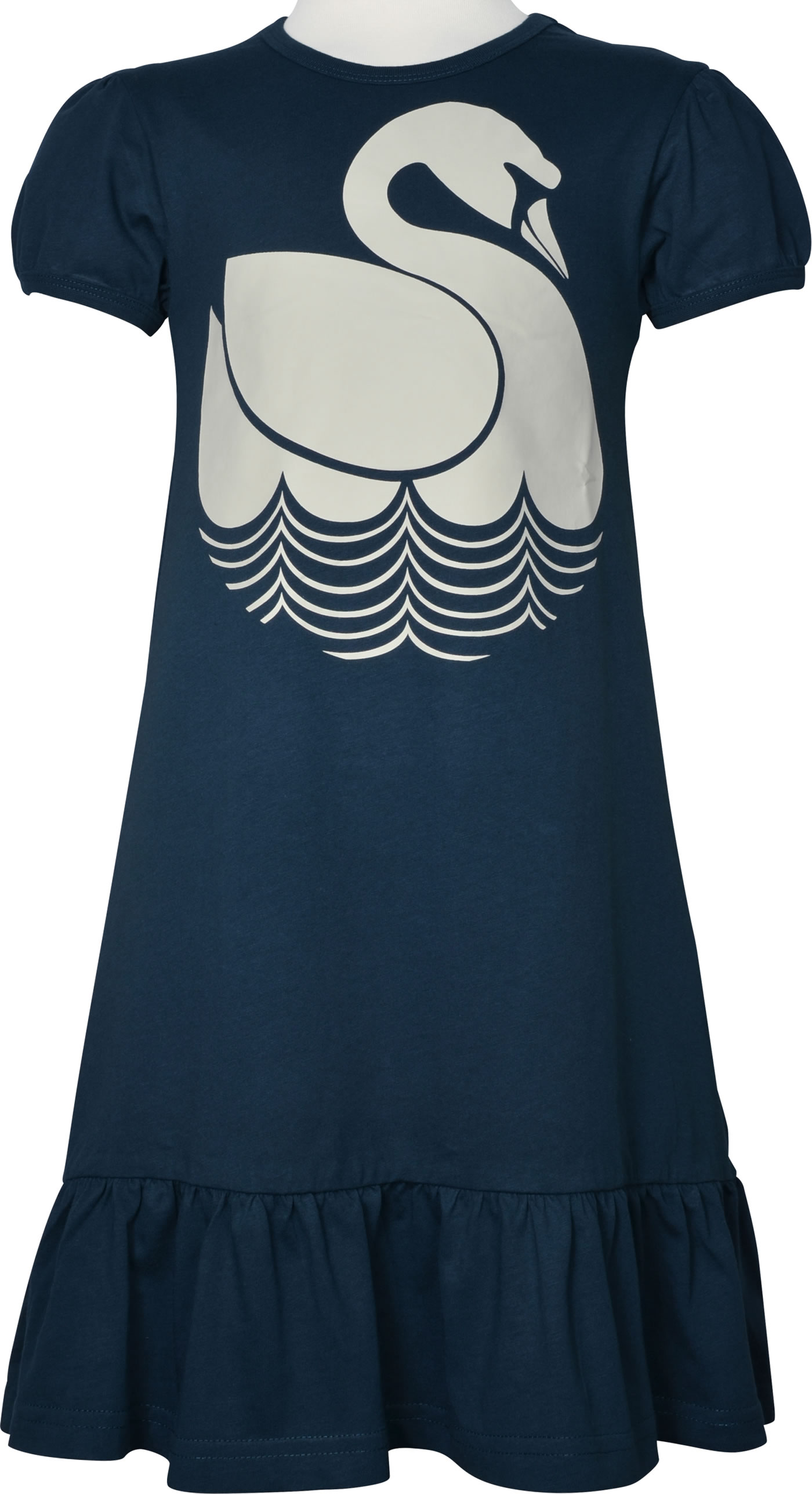 Beautiful jersey dress VESTERBRO with short sleeves in dark blue by DANEFAE with a swan on the front. Another pretty detail is the wide ruffle that gives the dress a feminine touch. The pleasant material offers a high level of comfort.