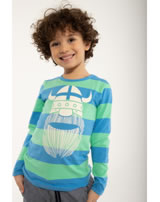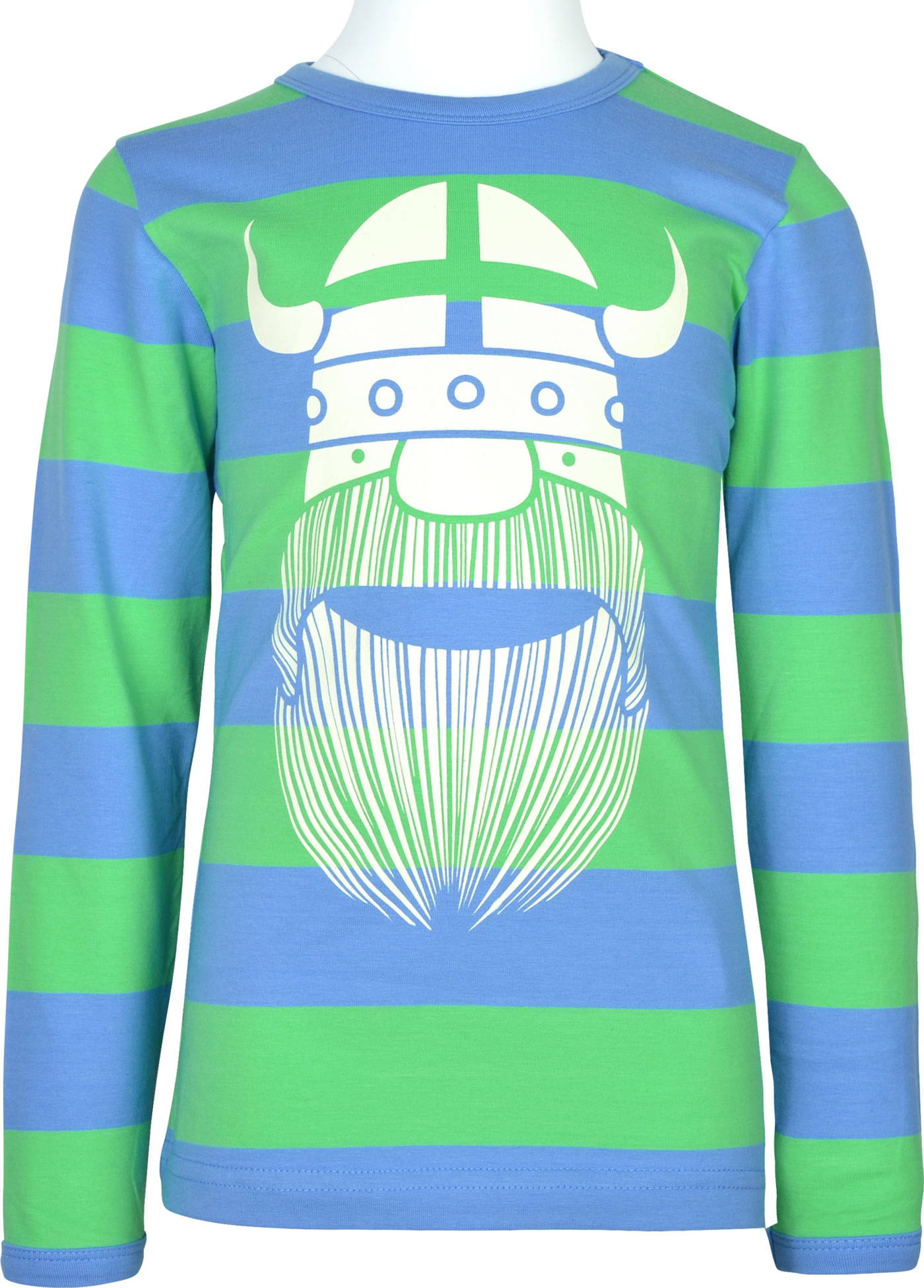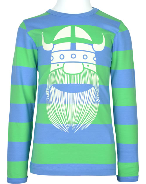 High-quality long-sleeved shirt in blue and green striped with great Erik viking print by DANEFAE. The soft and elastic material ensures a high wearing comfort.