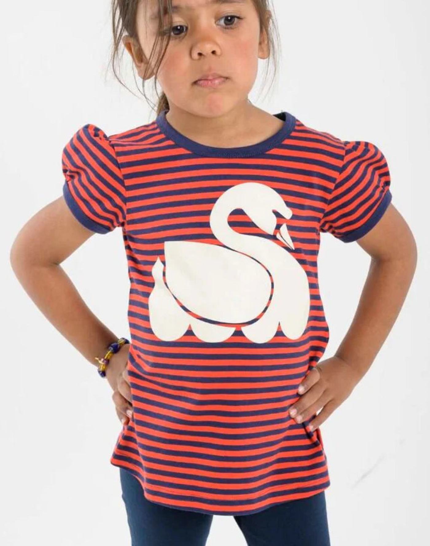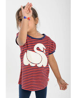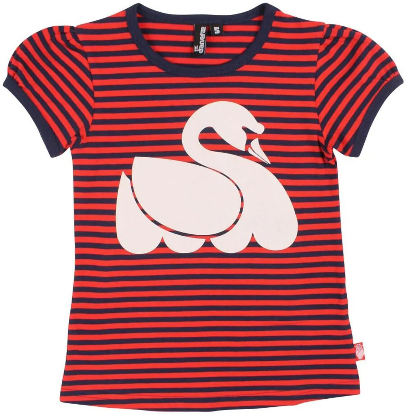 High-quality Baggaardskat Tee for girls by DANEFAE. On the front of the girly shirt there is an enchanting print of a swan. In addition, the beautiful puffed sleeves are a nice detail.