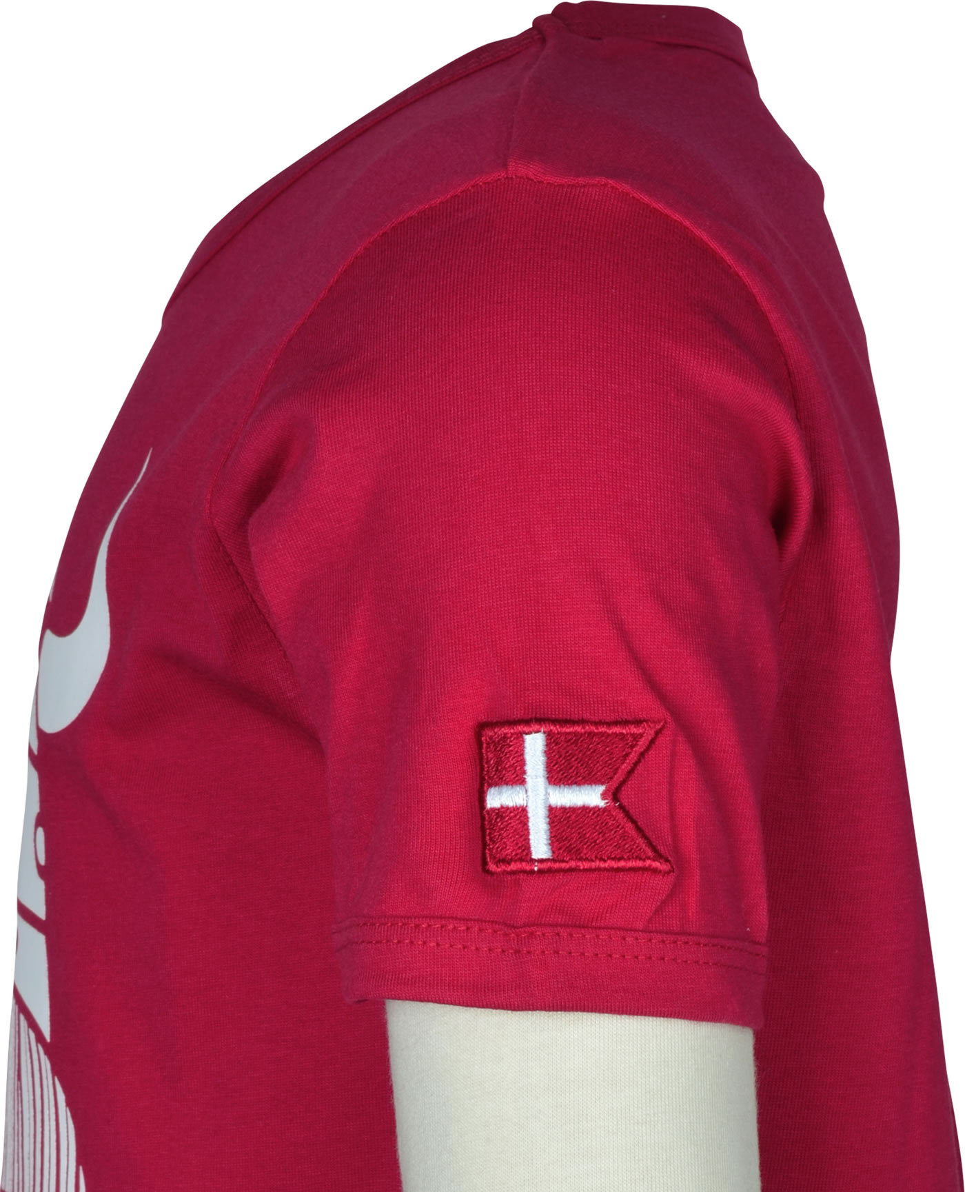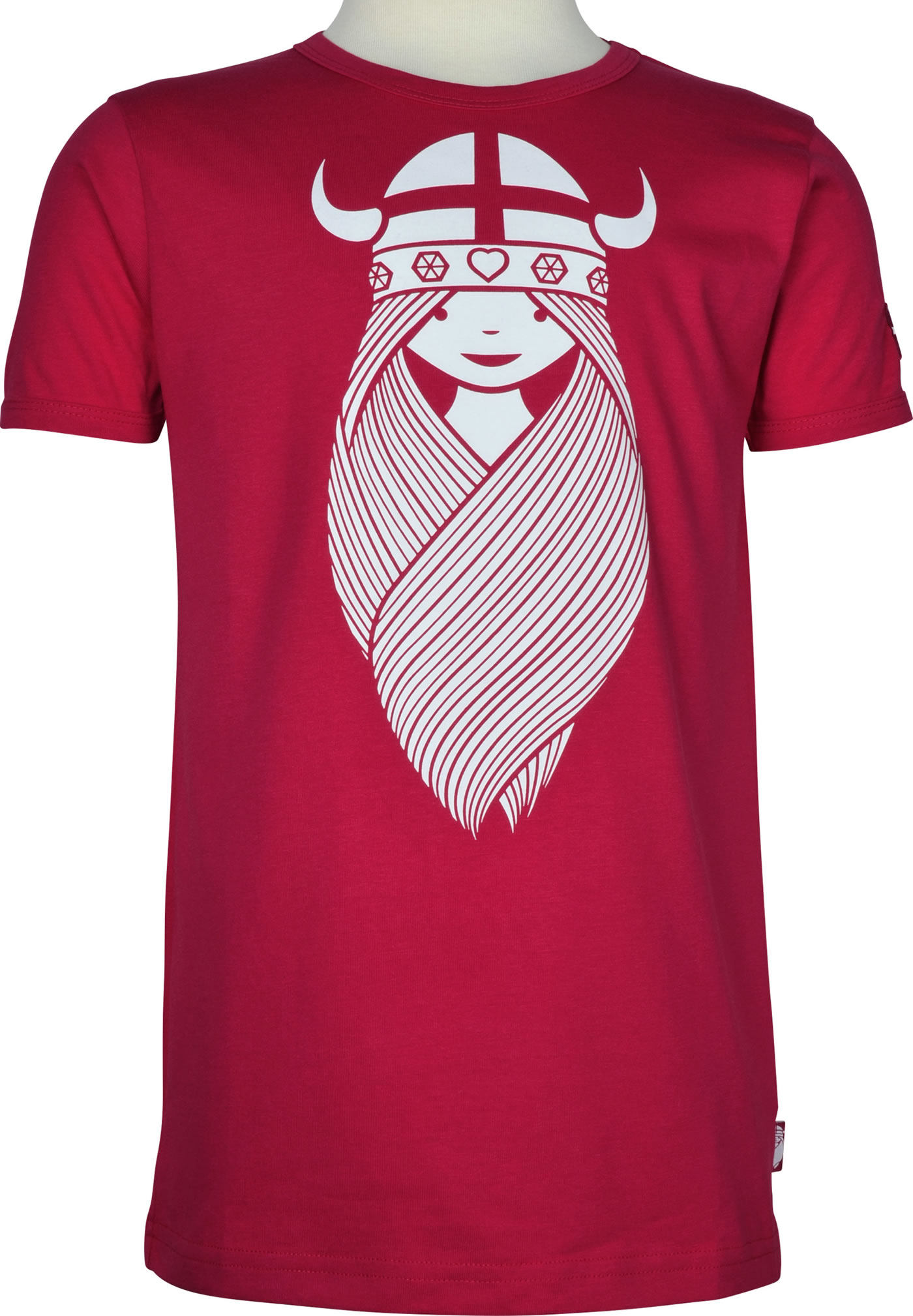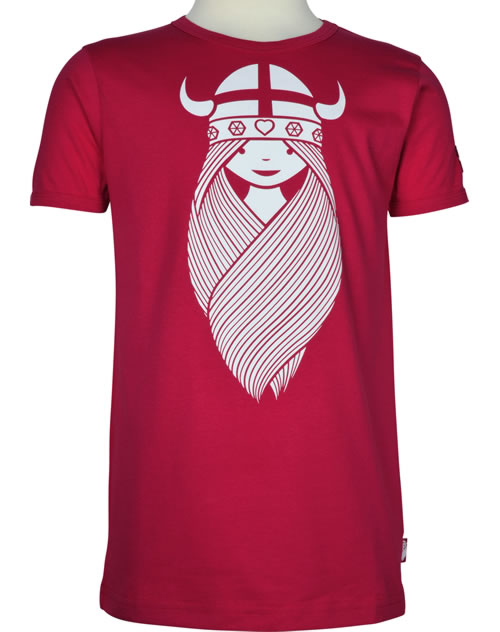 High-quality short-sleeved shirt by DANEFAE in red with a cool print of Winking Princess Freja. The Danish flag is on the left sleeve. The soft material ensures a high level of comfort.