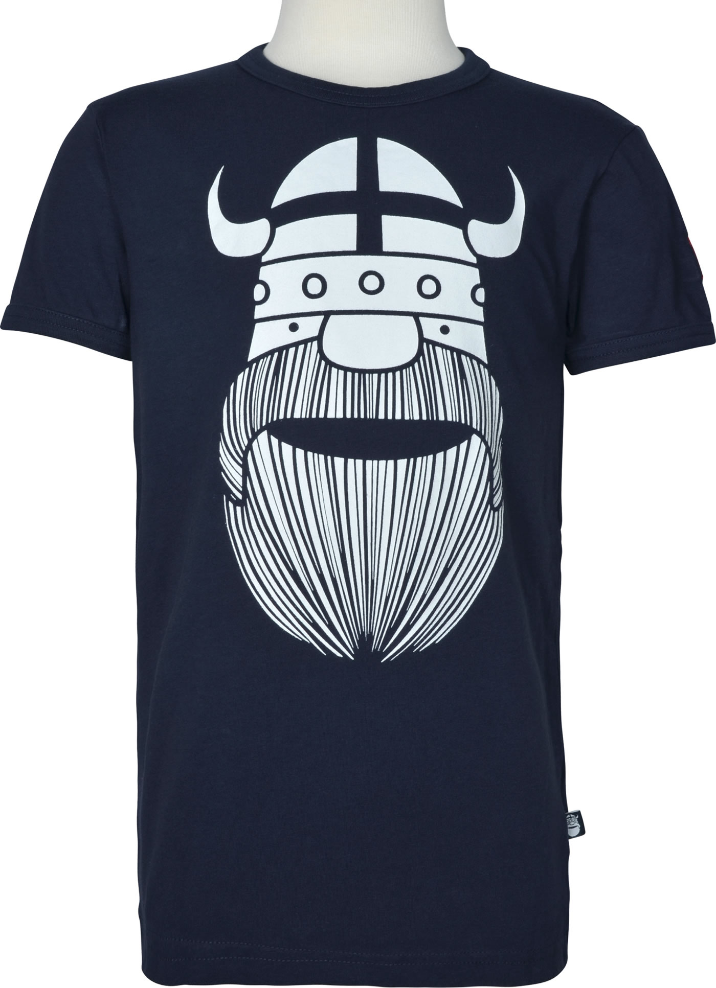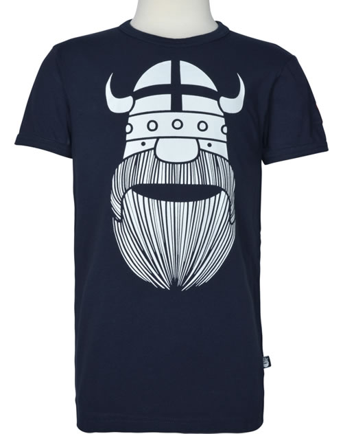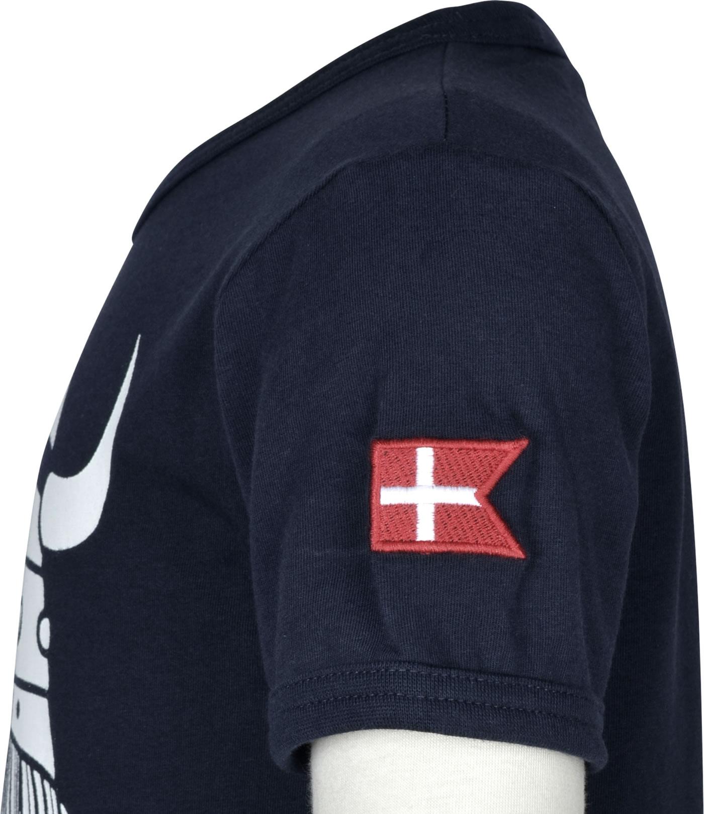 High-quality short-sleeved shirt in blue with a cool Viking print by DANEFAE. The Danish flag is on the left sleeve. The soft material ensures a high level of comfort.