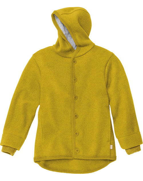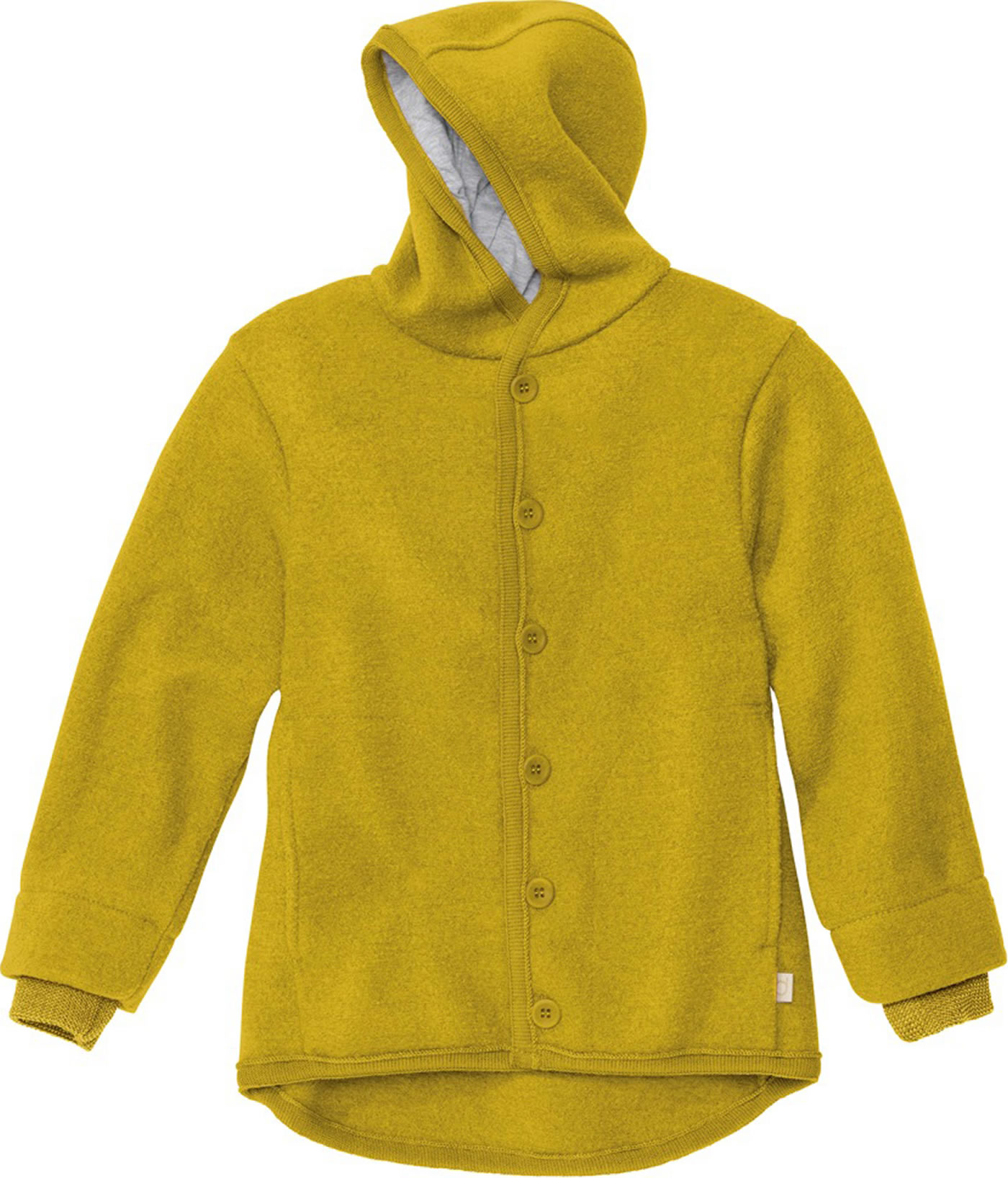 Very comfortable and high-quality boiled wool jacket with hood by DISANA. The finely crafted boiled wool made of organic merino wool keeps you cozy and warm even in cooler temperatures. The shape of the hood adapts to the child's head. Thanks to the large corozo buttons, putting them on and taking them off is child's play. While the hood, neck and shoulder are lined with an additional layer of cotton, the cuffs on the sleeves are finely knitted. The back is cut longer. The material supports a healthy skin climate. .