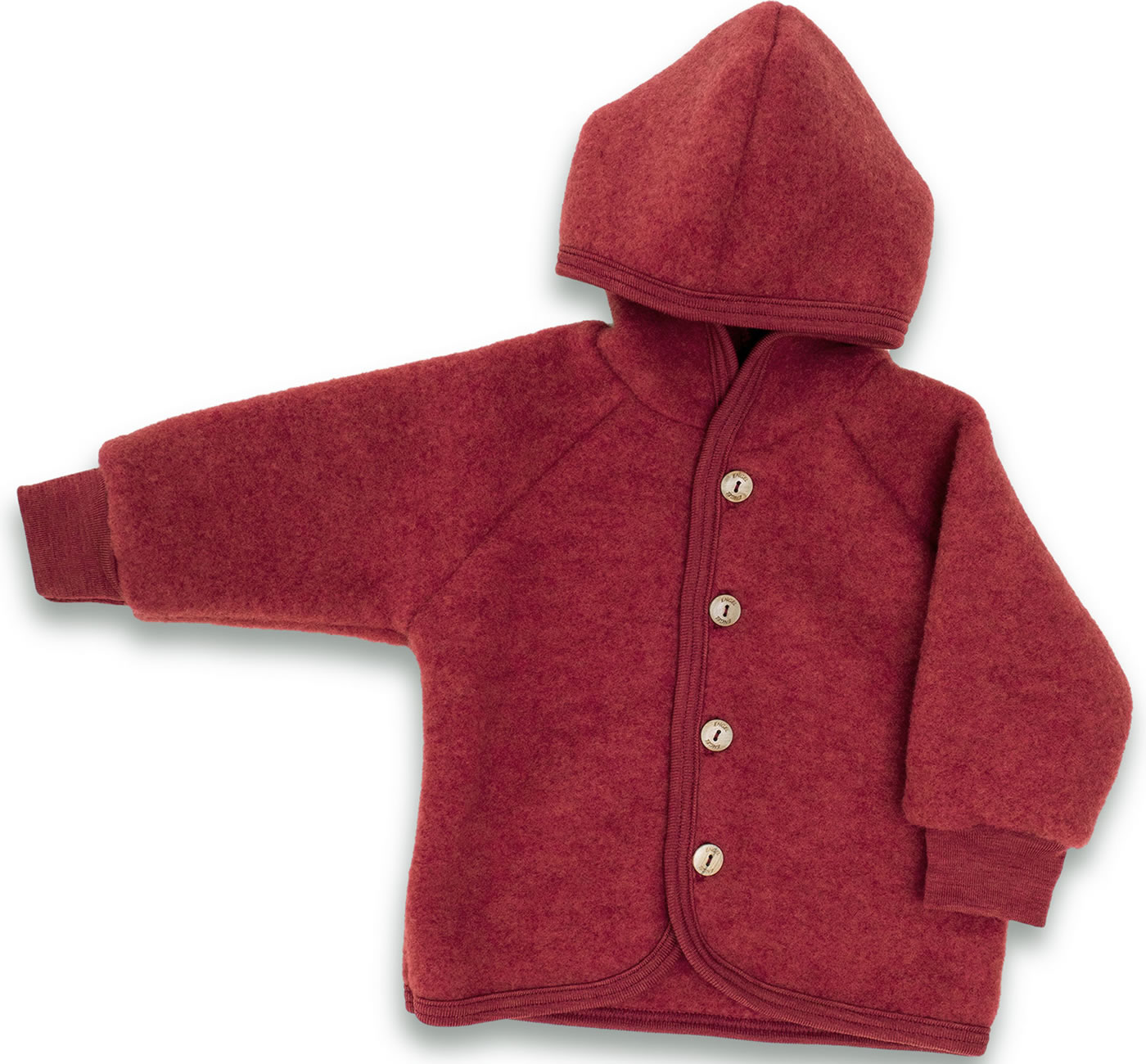 Super comfortable, fluffy fleece jacket with hood by ENGEL for babies and toddlers made of new wool. The material supports a healthy skin climate. The buttons of the jacket are made of wood.