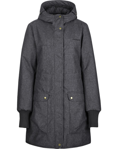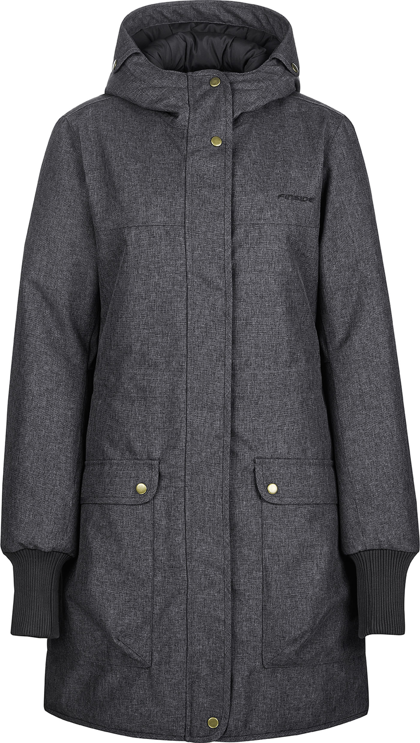 Waterproof and windproof women's winter parka OIKUUS with a tailored cut by FINSIDE. Large pockets with press studs offer plenty of space. The zipper is covered by a snap button strip. The large hood with drawstring is practical: thanks to press studs, it can be adjusted in height to keep your head warm and dry. The lining of the heat-insulating and breathable winter jacket is made in a coordinated color. The long and soft cuffs ensure high wearing comfort. The hem of the parka can be adjusted in width by means of a drawstring with elastic.