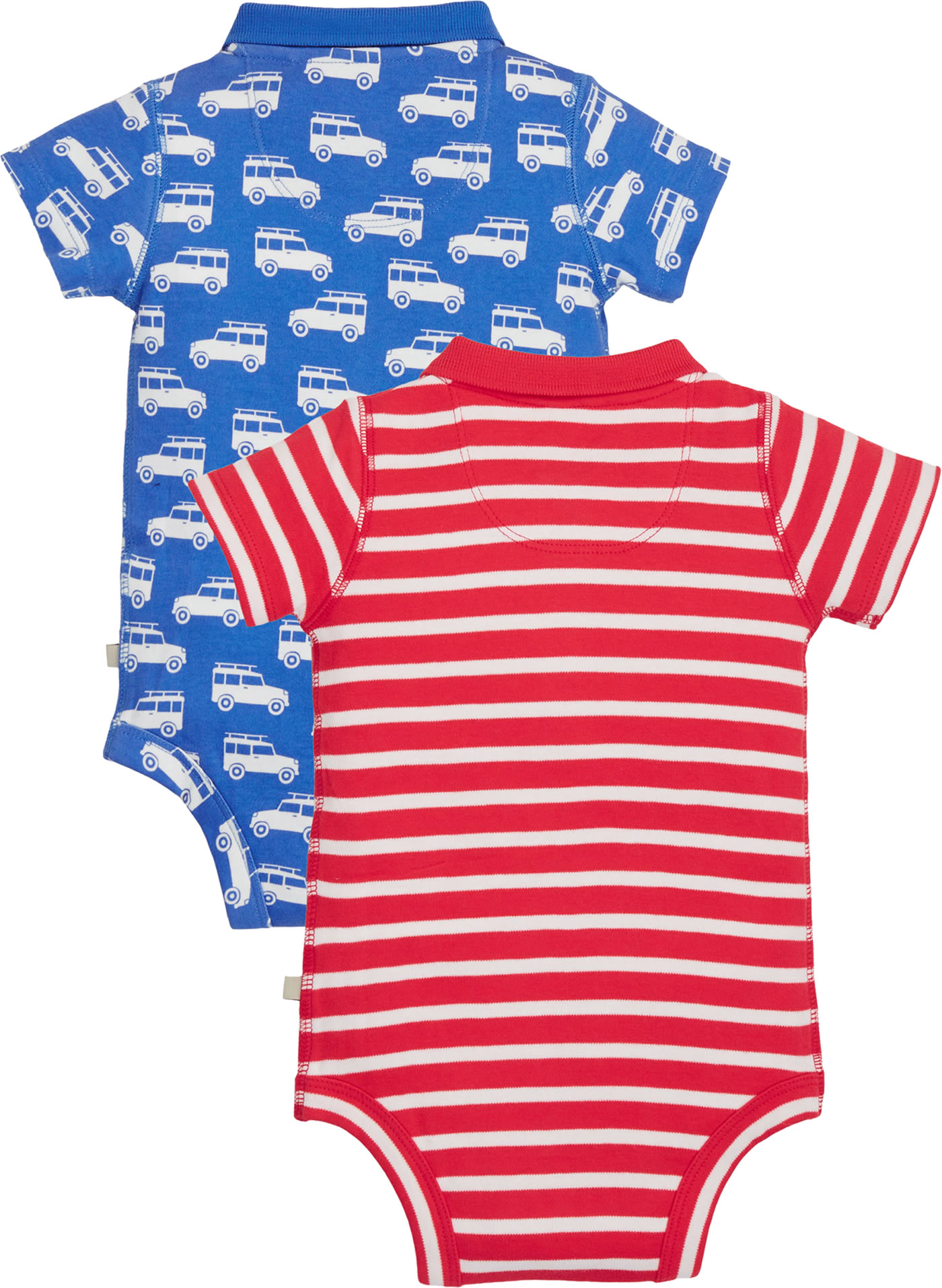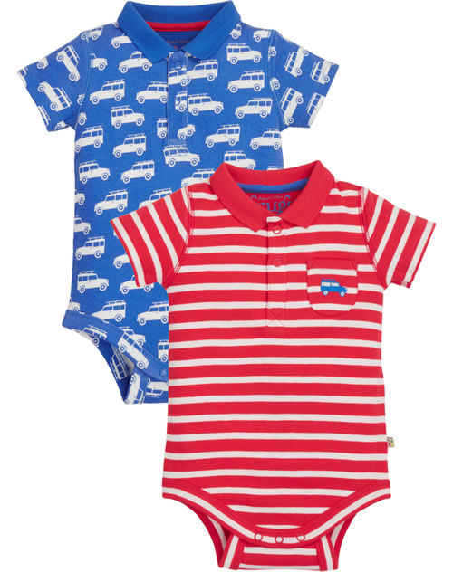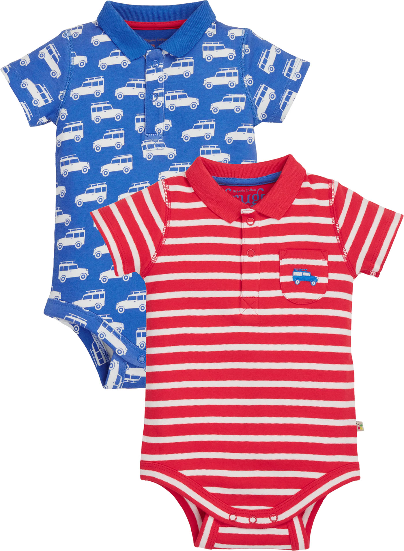 Short sleeve bodies in a pack of 2 by FRUGI for boys. The bodies are made of 100% organic cotton and are therefore very comfortable to wear. Snaps in the crotch and on the front make it easy to put on and take off. Beautiful details are the collar and the pattern of stripes and cars.