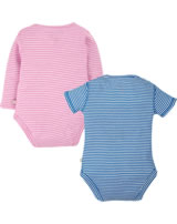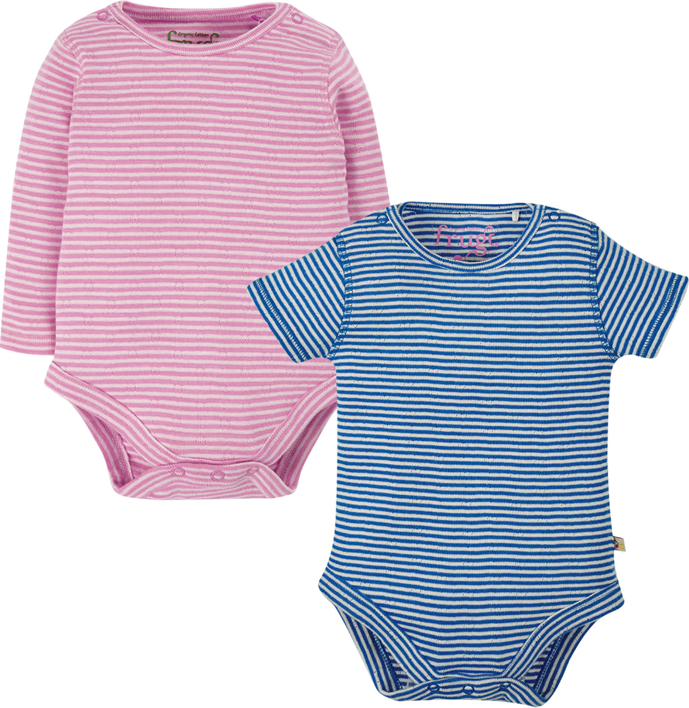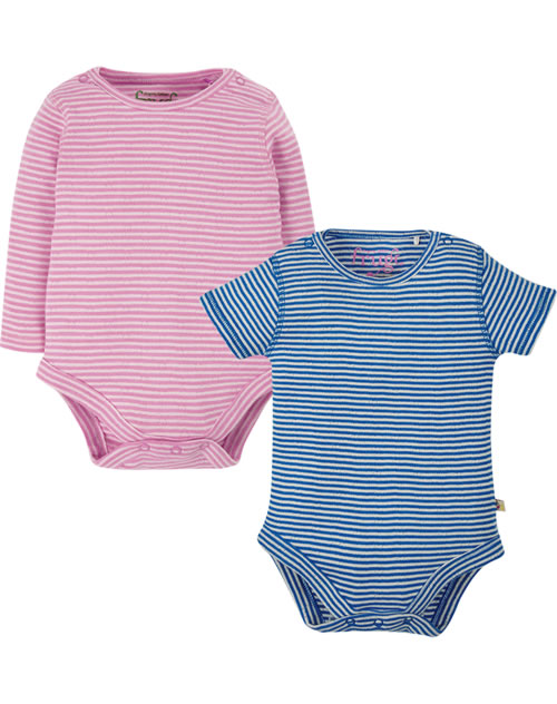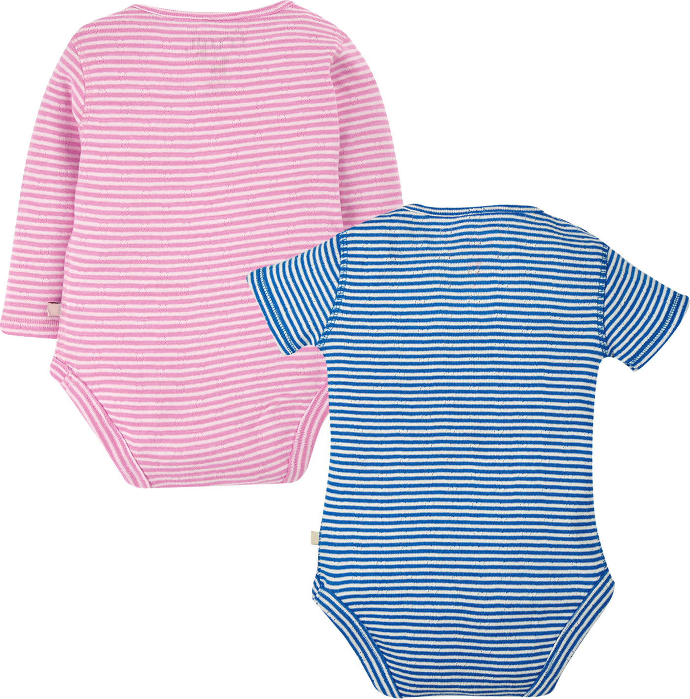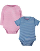 Gestreifte Bodies Lang- und Kurzarm im 2er Pack von FRUGI für Mädchen. Die Bodies bestehen aus 100 % organischer Baumwolle und sorgt für einen hohen Tragekomfort. Druckknöpfe im Schritt und auf den Schultern sorgen für ein leichtes An- und Ausziehen. Schöne Details sind die kleinen Blüten, die sich als Webmuster durch den Stoff ziehen.