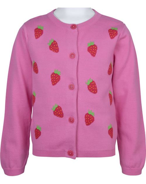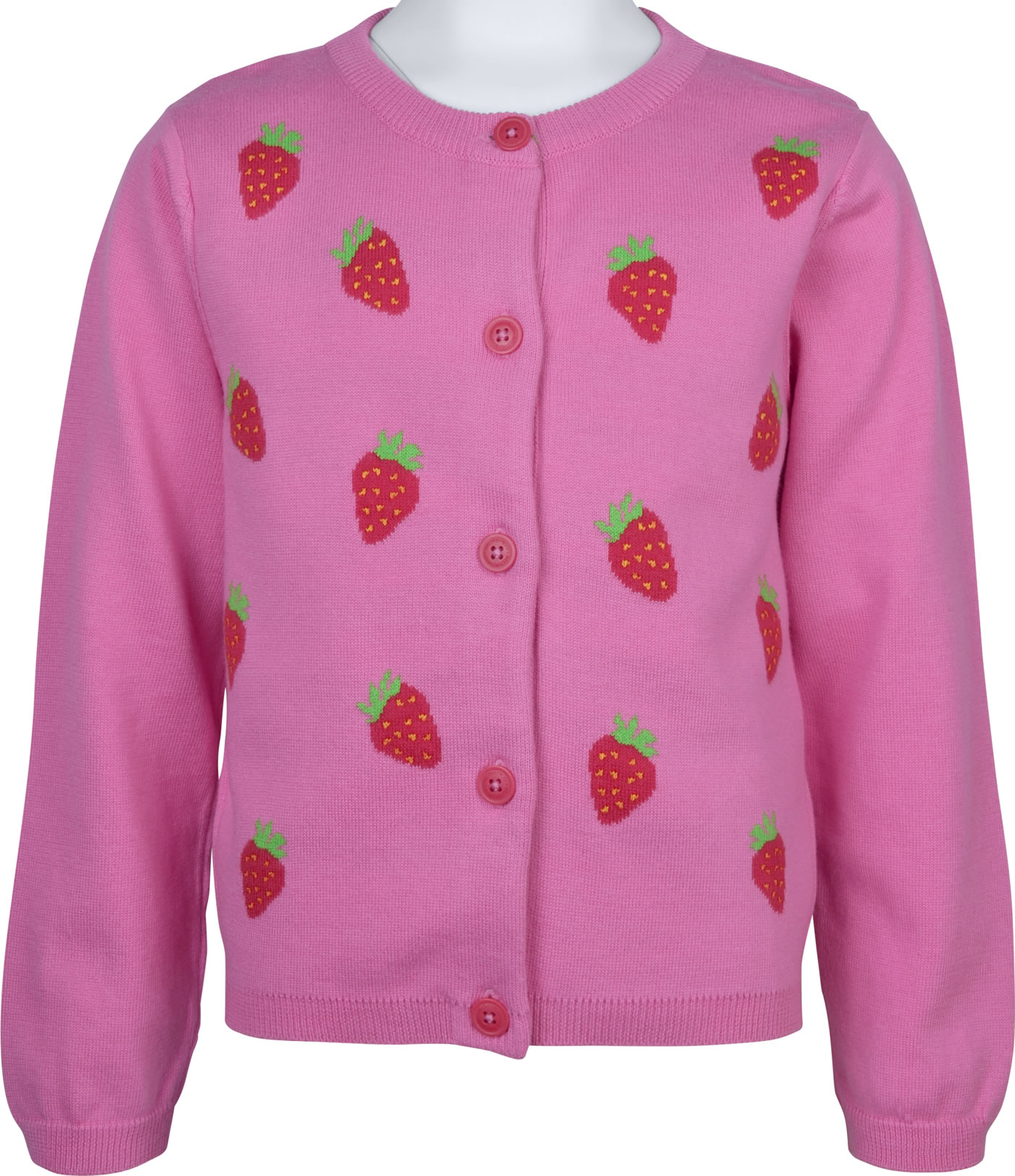 Pretty cardigan for girls by FRUGI. The long-cut cardigan closes with buttons. The soft material made of organic cotton ensures a high level of comfort. The knitted strawberries on the front are great eye-catchers.