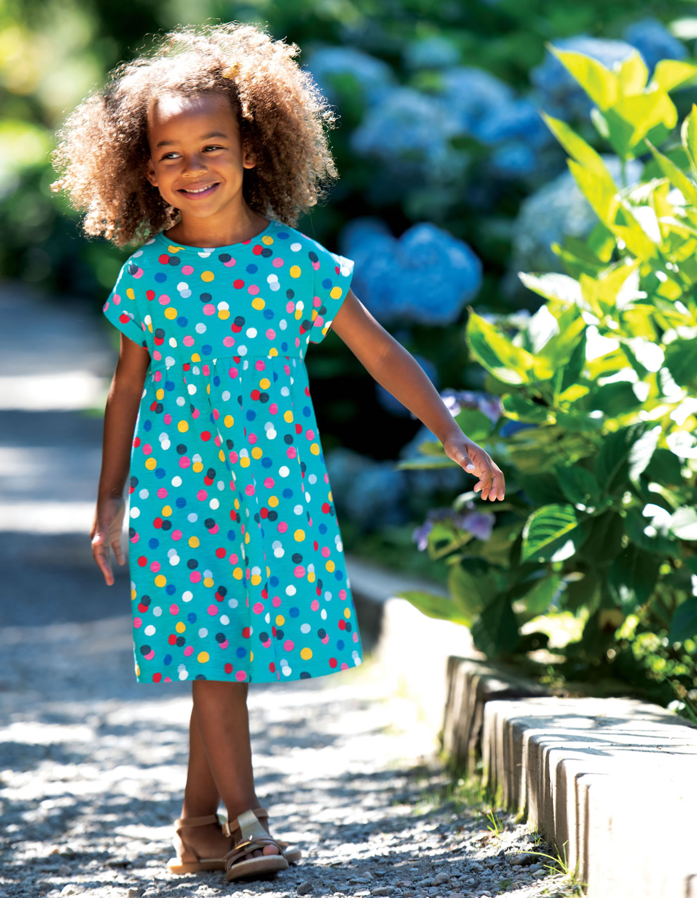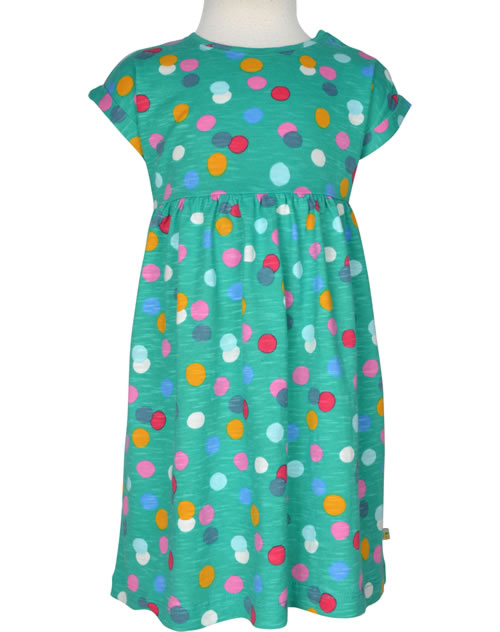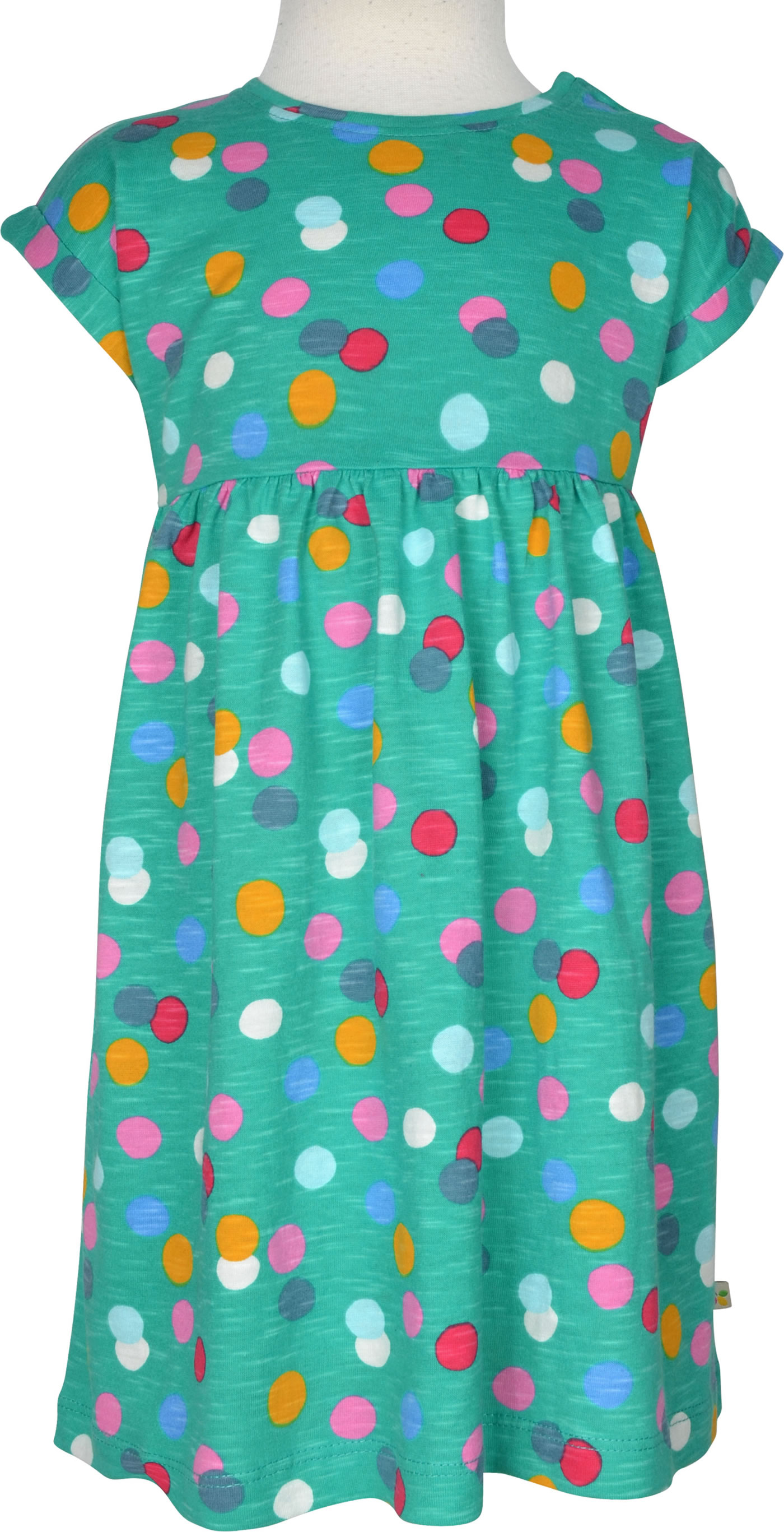 Pretty short-sleeved dress in green with colorful dots by FRUGI. The jersey dress is cut wide and will quickly become a girl's favorite. The organic cotton material ensures a comfortable fit.