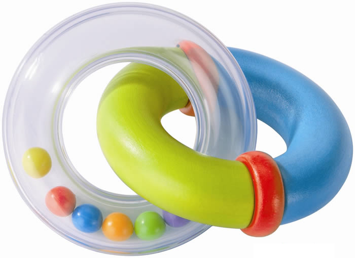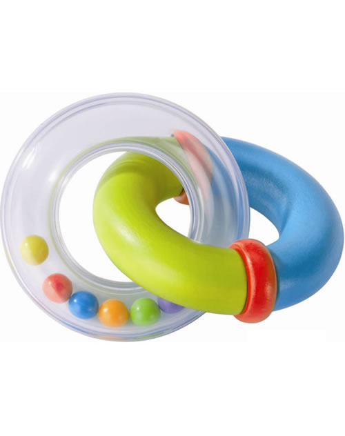 Double ring consisting in one wooden ring and one transparent plastic ring with five little moving balls. Material: maple wood and ABS plastic.