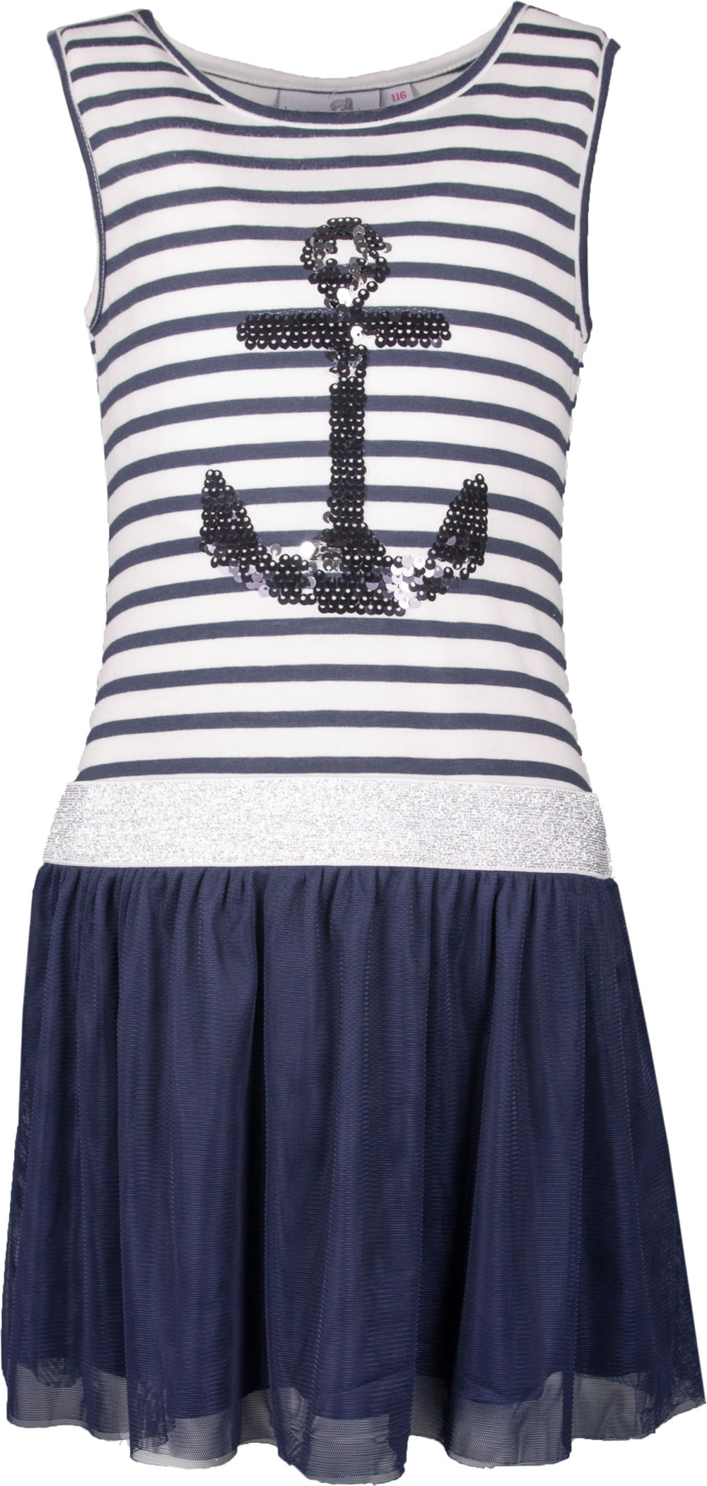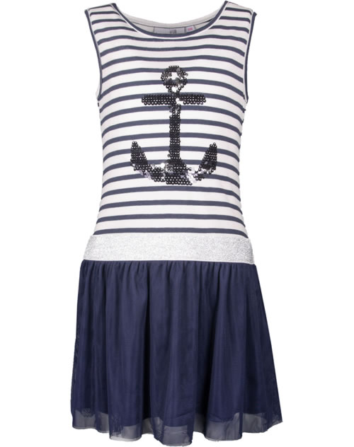 Pretty sleeveless dress for girls by HAPPY GIRLS by Eisend for the summer. The anchor made of reversible sequins on a white underground forms a nice contrast and blends well with the dark blue tulle skirt. In the waist is a nice glitter yoke in silver. The underskirt in dark blue offers the necessary privacy. A button on the back allows for easy on and off.