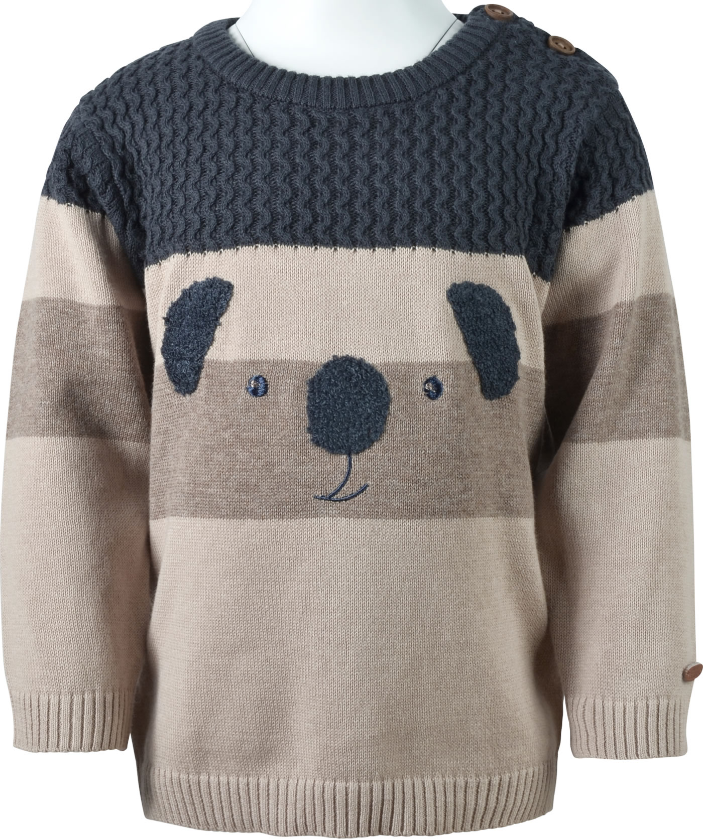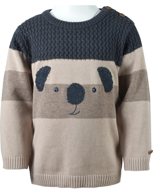 Warm knitted pullover in block stripes for boys by HUST AND CLAIRE. The loose cut offers plenty of freedom of movement. A great eye-catcher is the koala face on the front. Buttons on the shoulder make it easy to put on and take off.