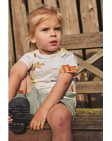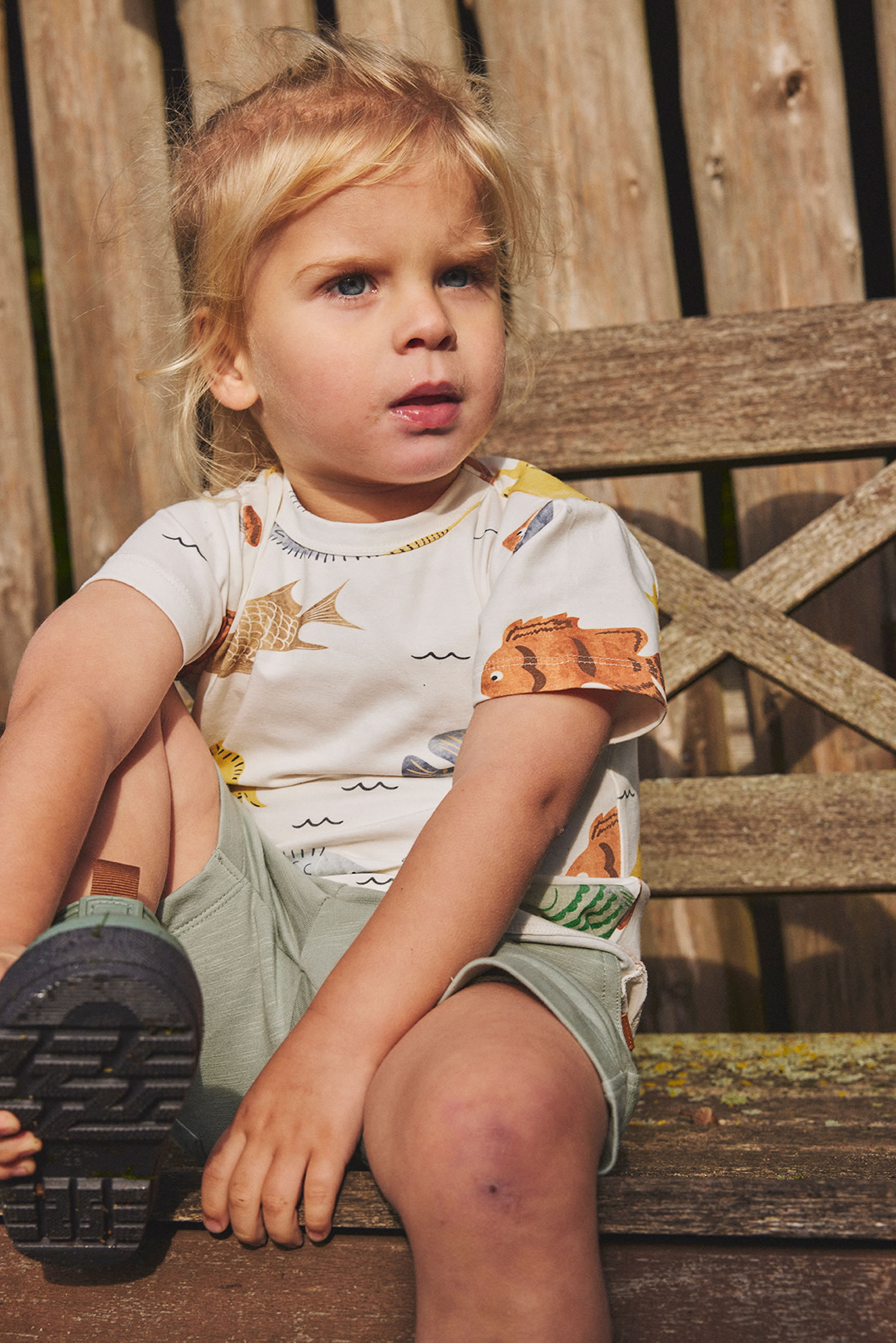 Great shorts for boys from HUST AND CLAIRE. The wide cuffs ensure a perfect fit. The width of the waistband can also be adjusted. Two side pockets and a back pocket offer space for small items. The soft sweat fabric is made from ecologically produced cotton.